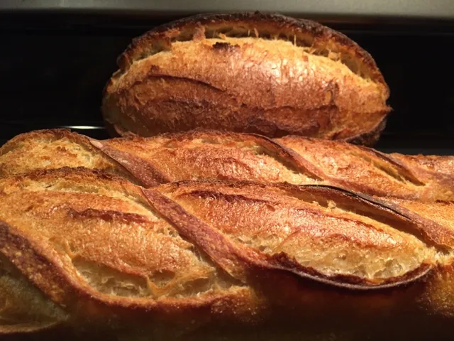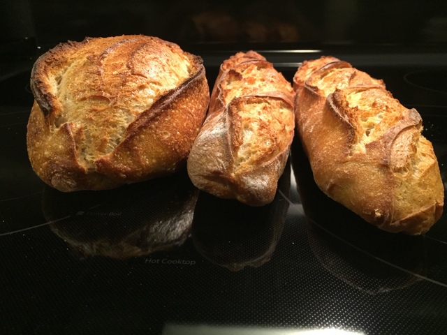 | Bake at 455dF till brown. ~13 minutes with steam, ~12 minutes more for baguettes or 15 more for batards. 2 minutes venting. | ||||||||