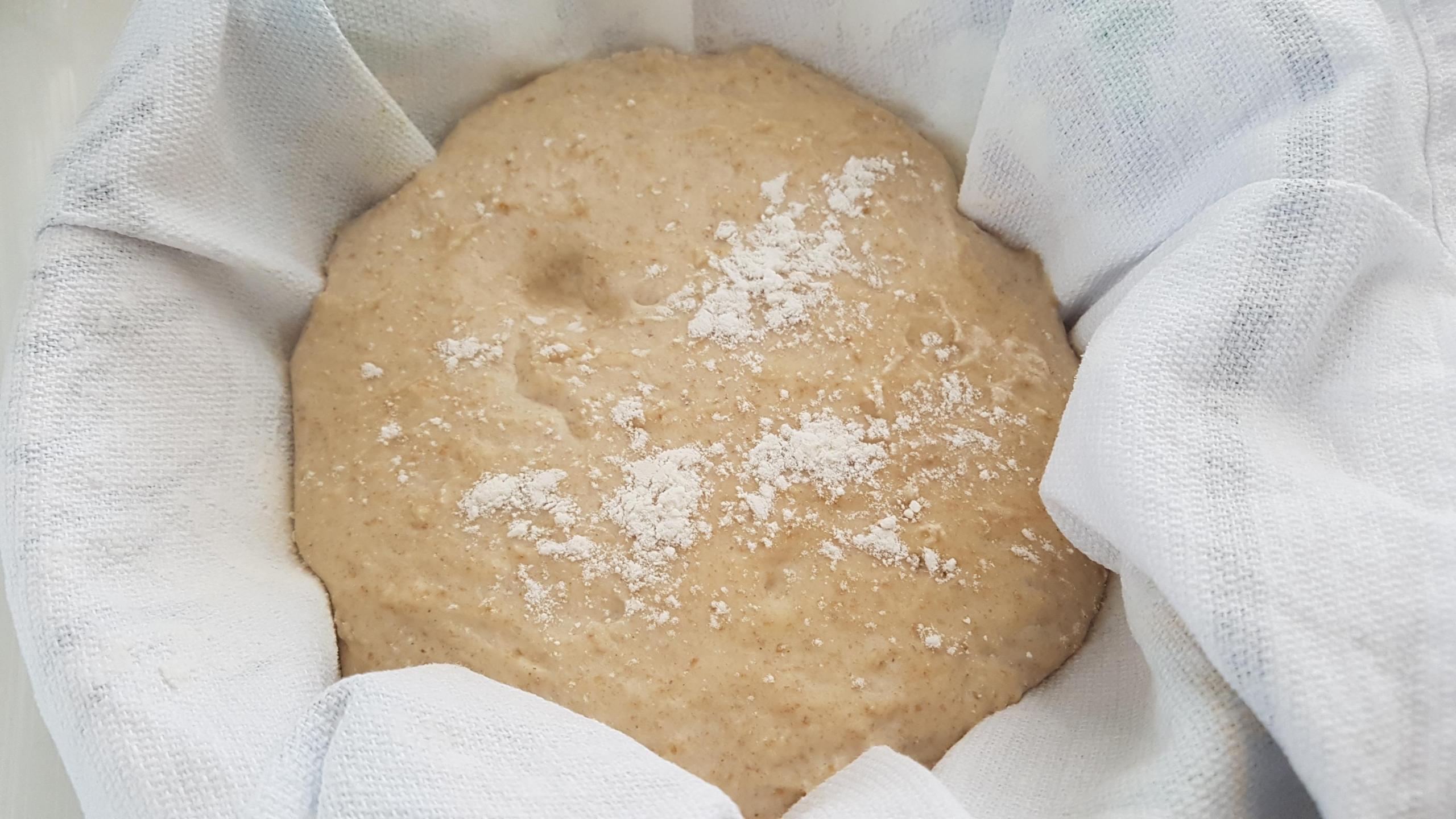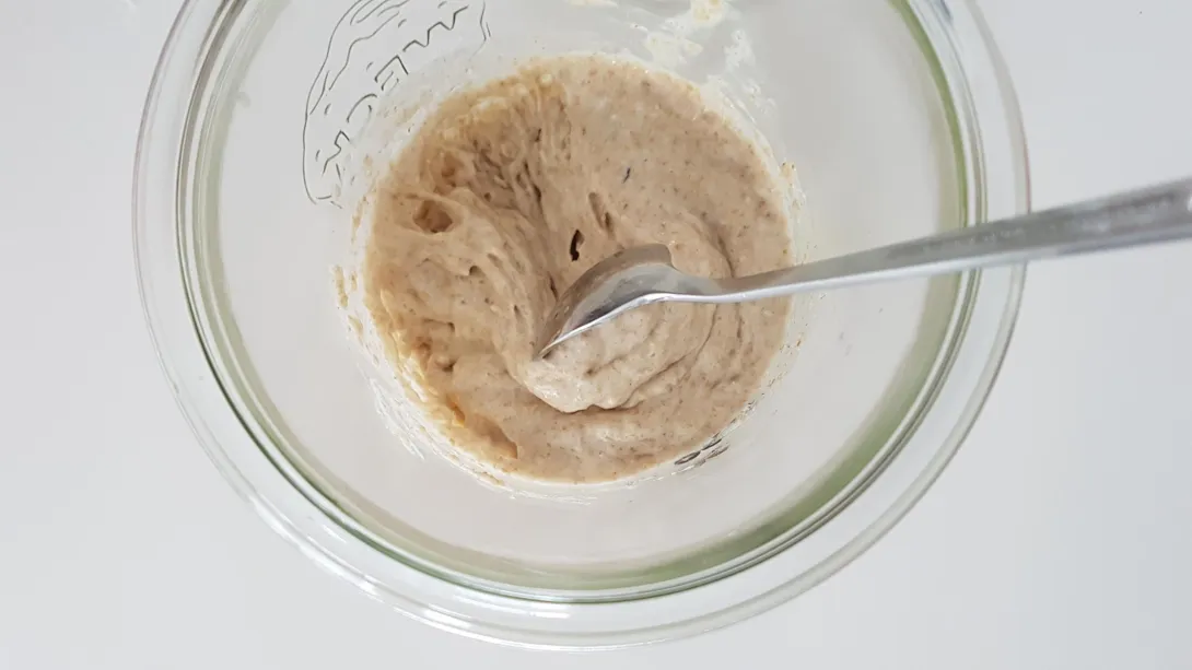 In the evening, mix 75 g of white wheat flour (bread flour) with 75 g of water and 1 tablespoon of your mother sourdough starter.