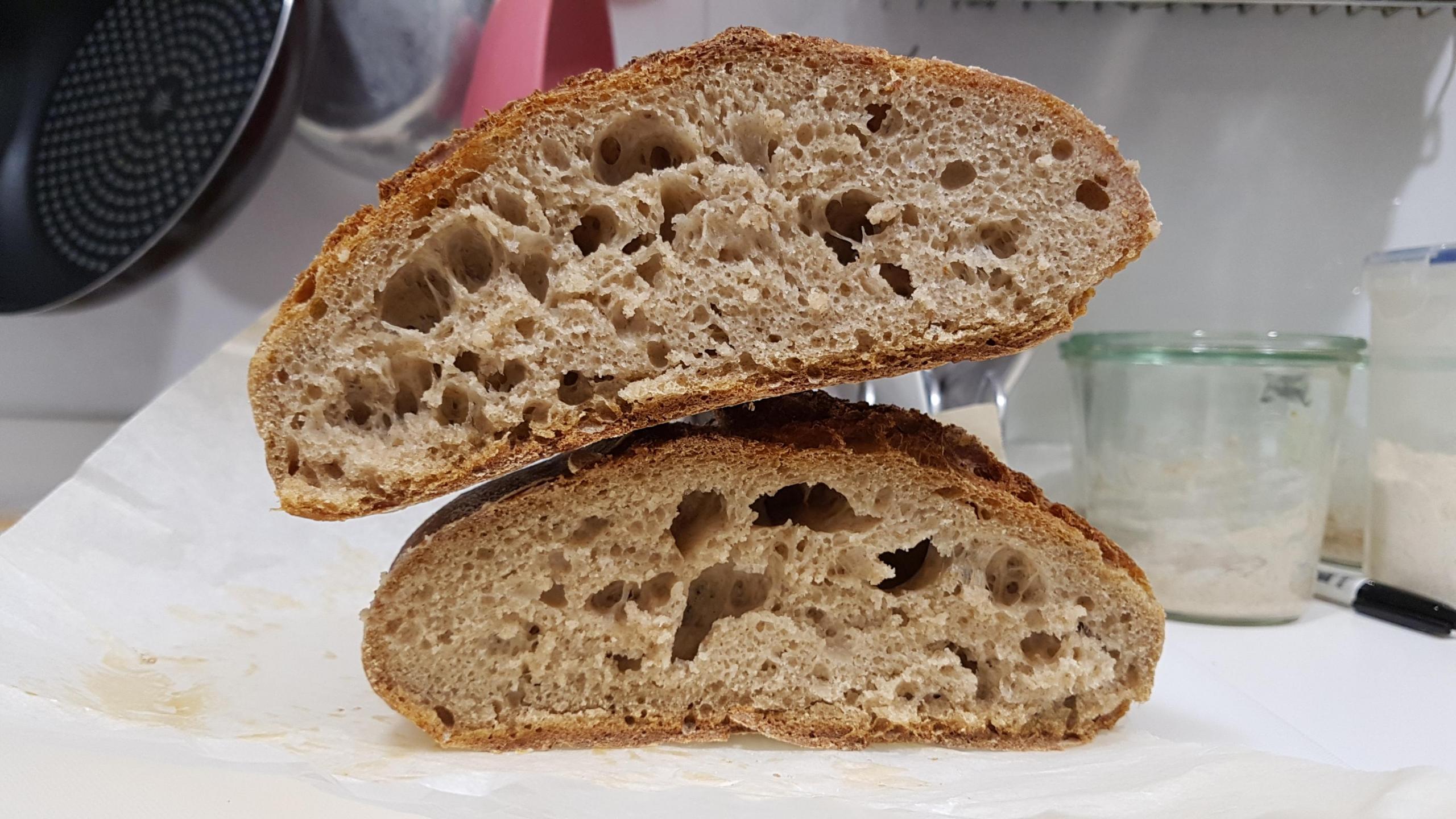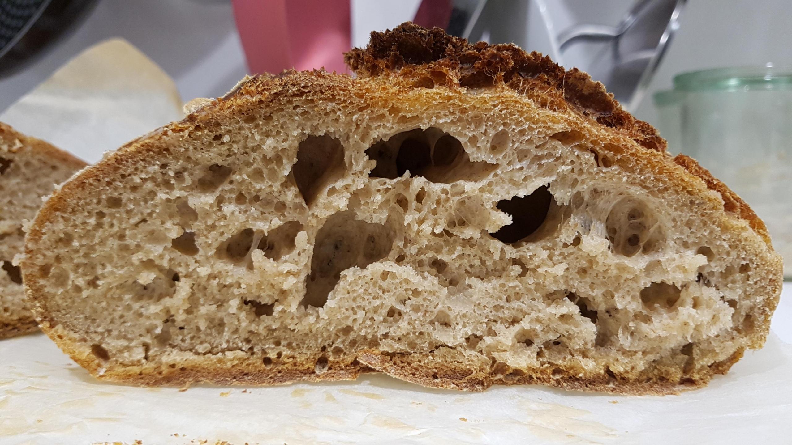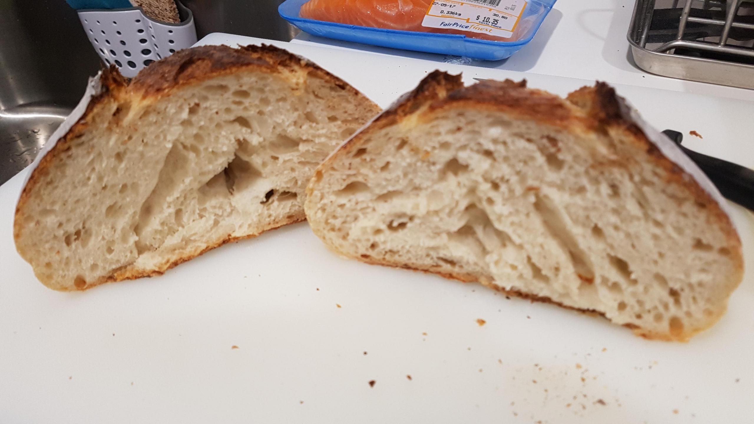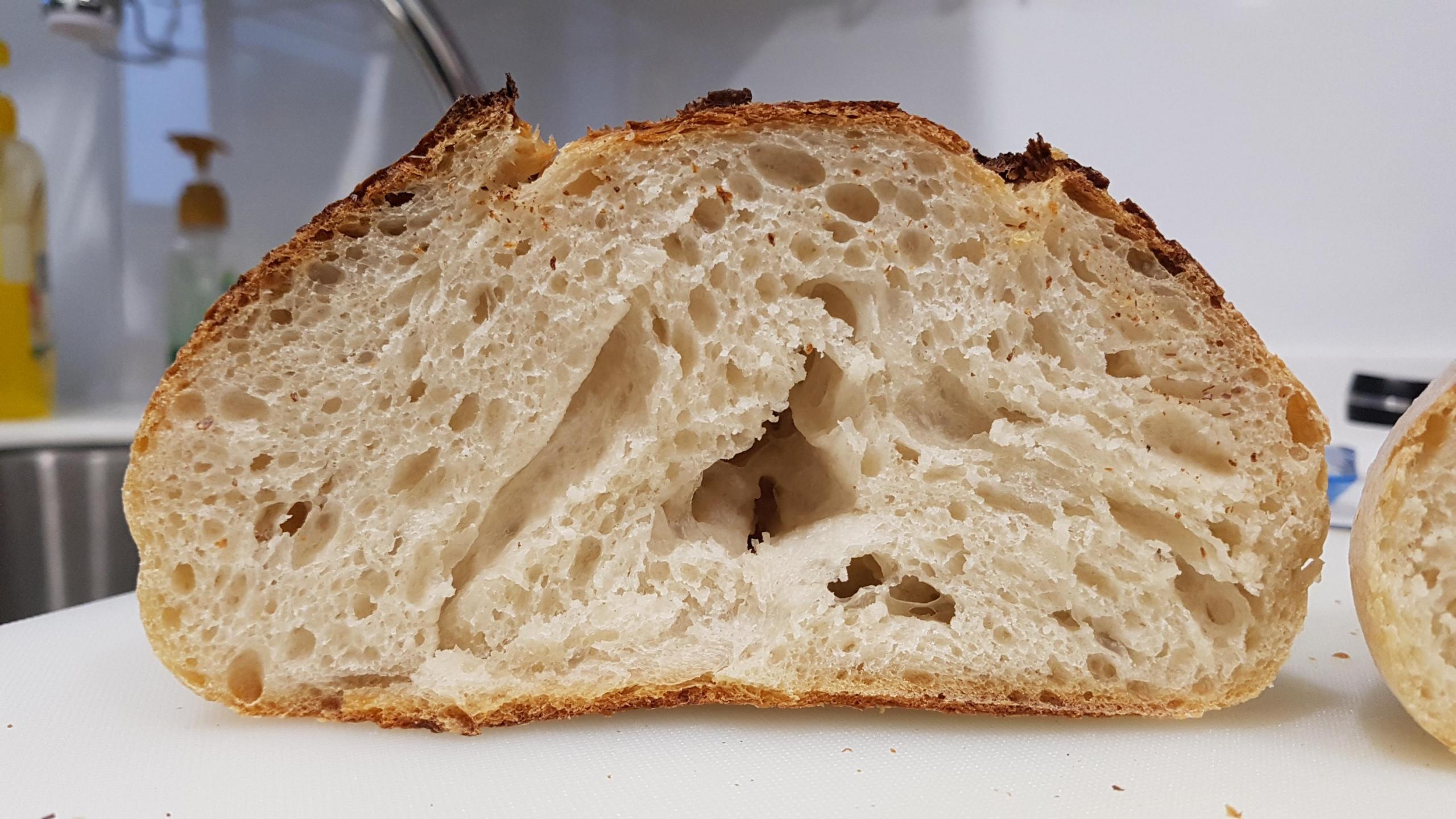 Another round of baking, crumb seems better but there are still large holes in the middle, not enough folding during bulk fermentation?