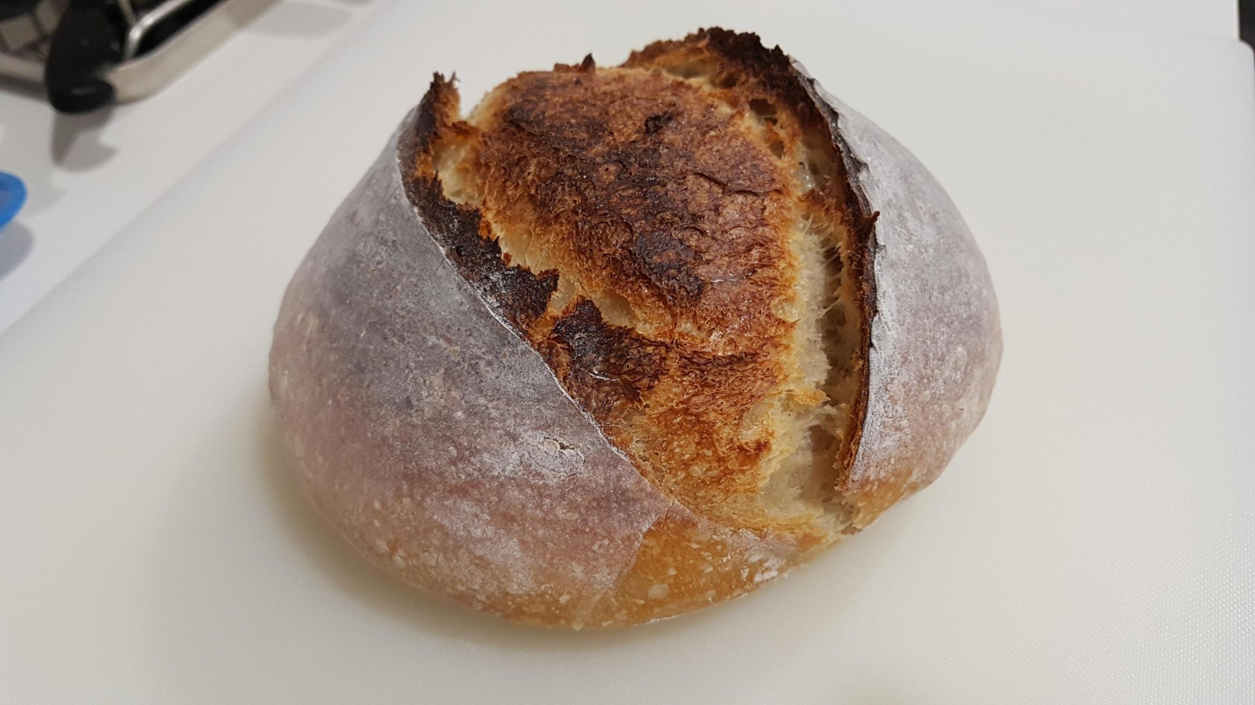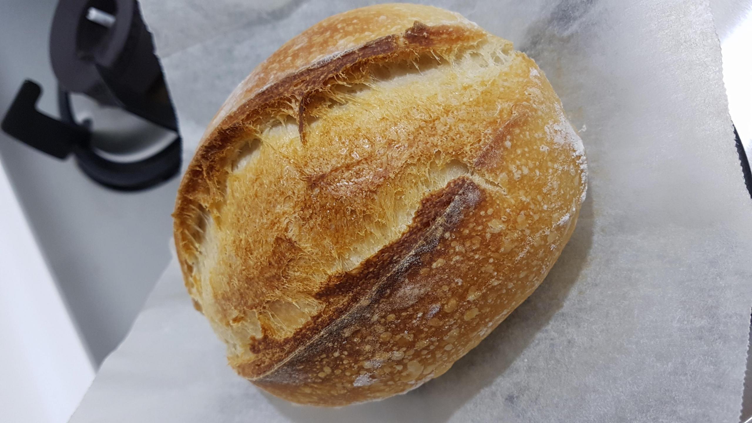Leaven mixed with water and flour, left to rest for 40 mins, salt mixed into dough. Dough was kneaded for 10 mins. Bulk fermented for 3 hrs at 28°C, 3 foldings done between half hour interval. Dough was firm and volume increased about 50%. Folded and rested 20 mins before final shaping. Could see air bubbles on the dough. Left to proof for 4hrs at 28°C. Dough volume increased about 60%. Did finger poke test, dough came back up but dent was still visible. Baked at 230°C for 15 mins, 200°C for 25 mins, added 5 mins of 230°C for darker crust.