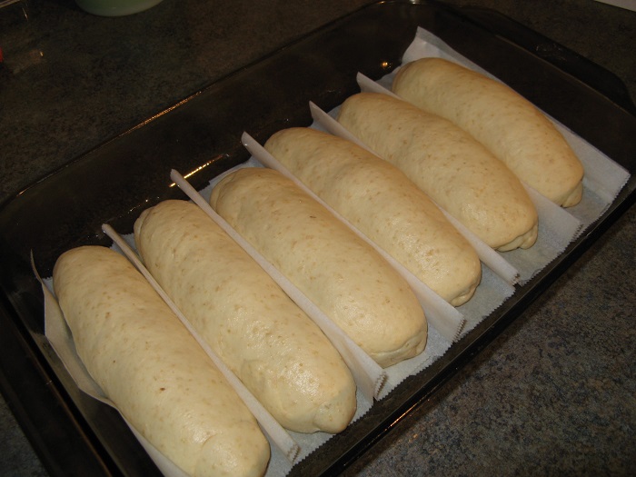 I had an urge for some hot dog buns yesterday, and don't happen to have a hot dog bun pan (just another thing I don't have room for in my kitchen). So I pleated up some parchment paper and put it in a rectangular glass cake pan. I sprayed it with pan spray so there was no problem removing the buns later. It worked a treat! Oh, and the recipe was King Arthur Flour (Golden Pull-Apart Butter Buns) with fresh stone-ground soft white whole wheat flour subbed in for some of the bread flour.
