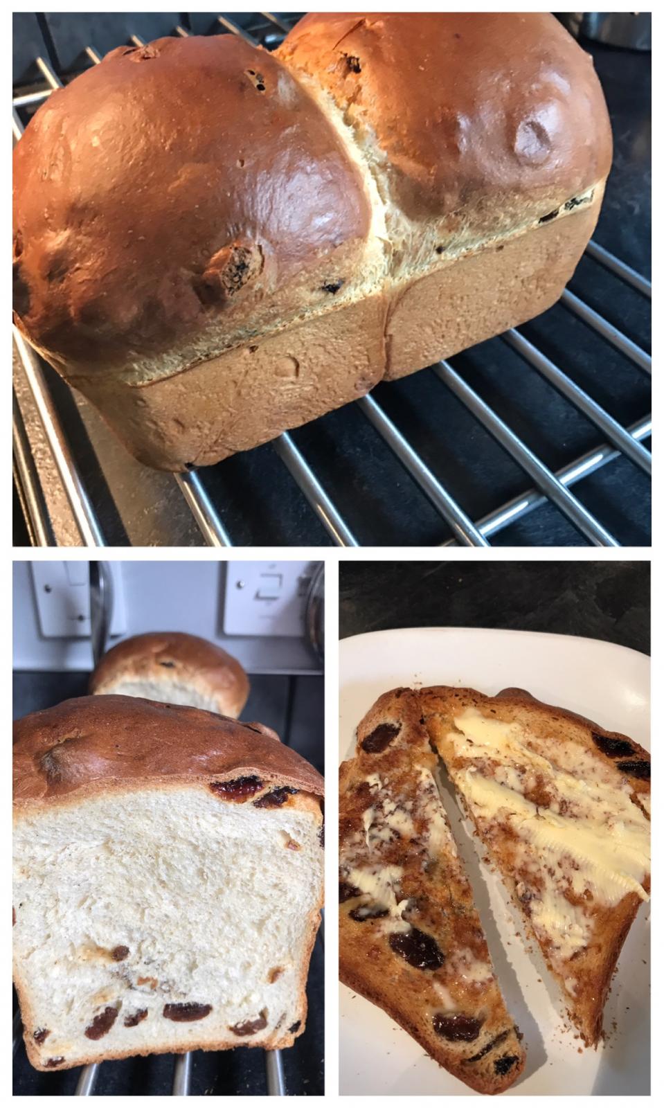 yayyy much happier with this loaf...it took 60mins to cook. I had it in and out the oven 3 times in the last 15 mins taking the temp. I gave up when it reached 195 F and took it out. It was cooked and I was happy, tastes great, but sultans instead of raisins have migrated to the bottom a bit and are not so evenly distributed....I put the fruit in the mixer at the end of kneading then hand kneaded for a few mins as well...maybe need more fruit....