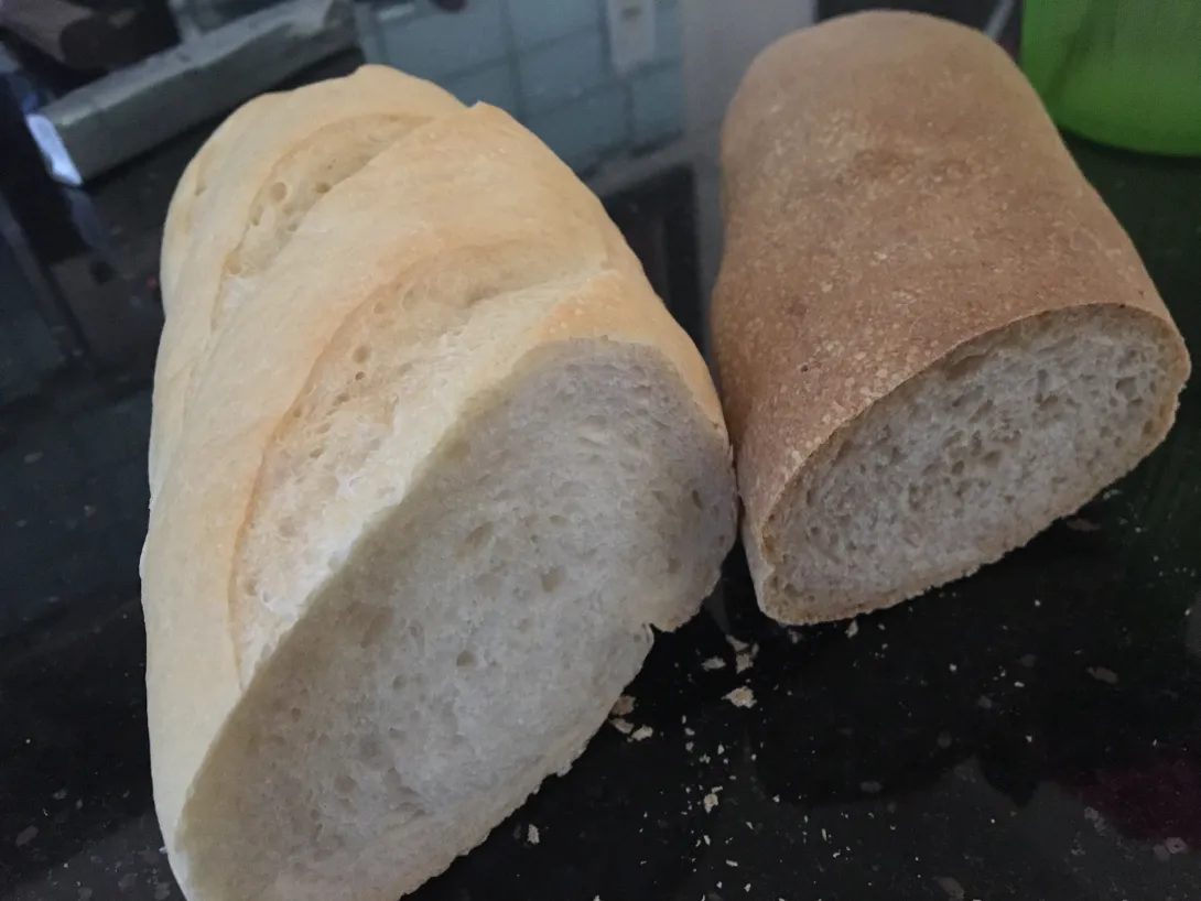 - the brown bread is example where i was trying to roll and fold it but ended up making/seeing tears in the dough (seen on surface- not complete through tears). I had to leave this one at least 2 hours for it to rise and still was smaller. ( i didnt cut this one i was afraid it would deflate). center is ok maybe dryer than usual. Sizewise its how the white would do if i miss-handle the dough.