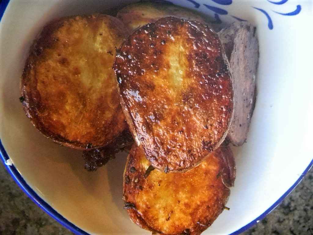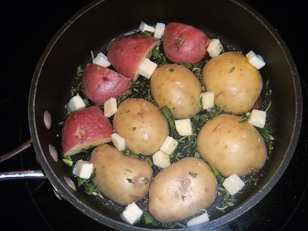 Potatoes butter rosemary and basil with 1/8th cup of water steamed woith lid on and then removed until browned becomes the best fried, herb potatoes ever!