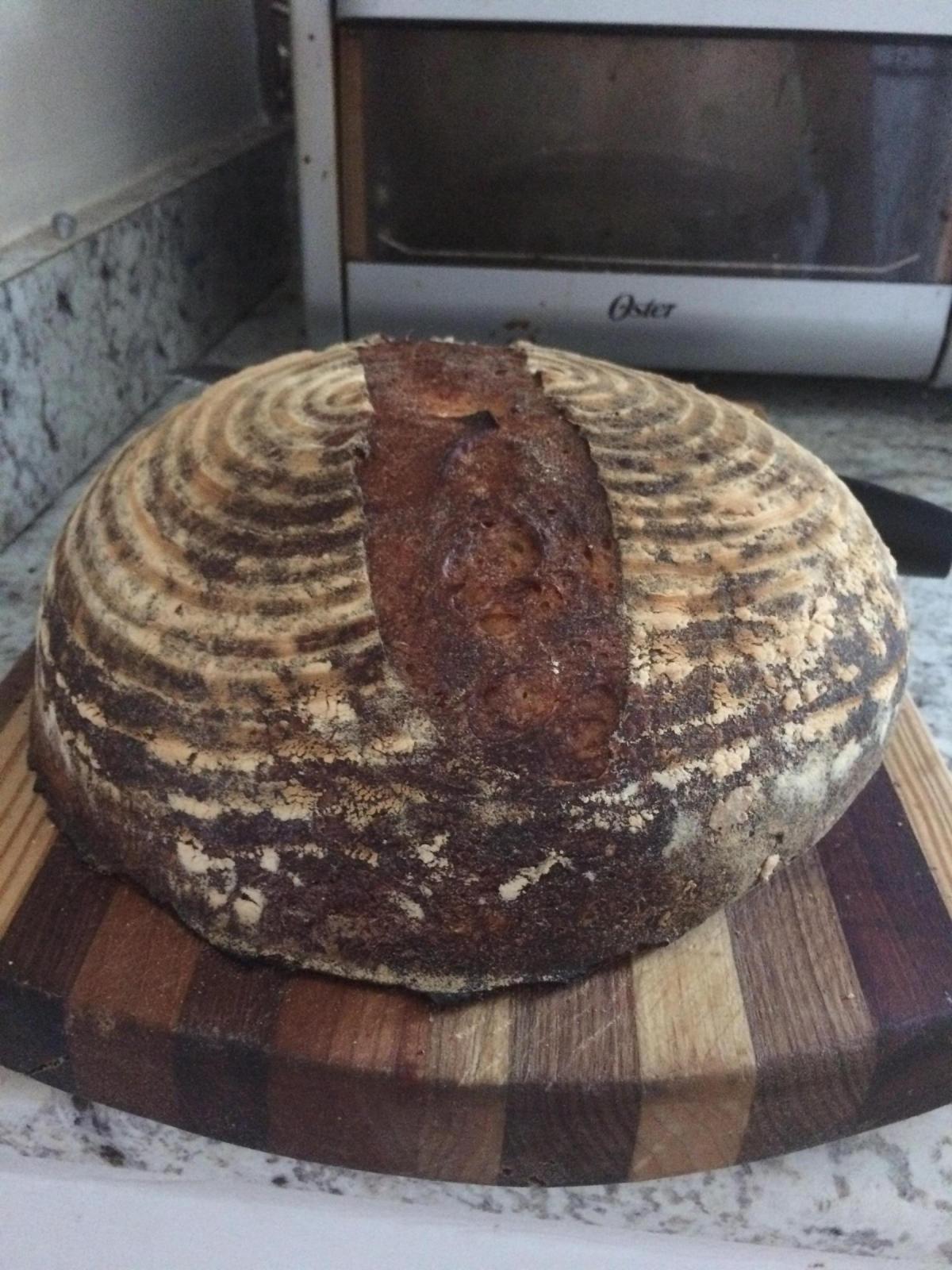 Shaped into boules. Proofed in banneton baskets for another two hours in warm back room. Baked at 500 degrees on a pizza stone with a cast-iron casserole over top of loaf.