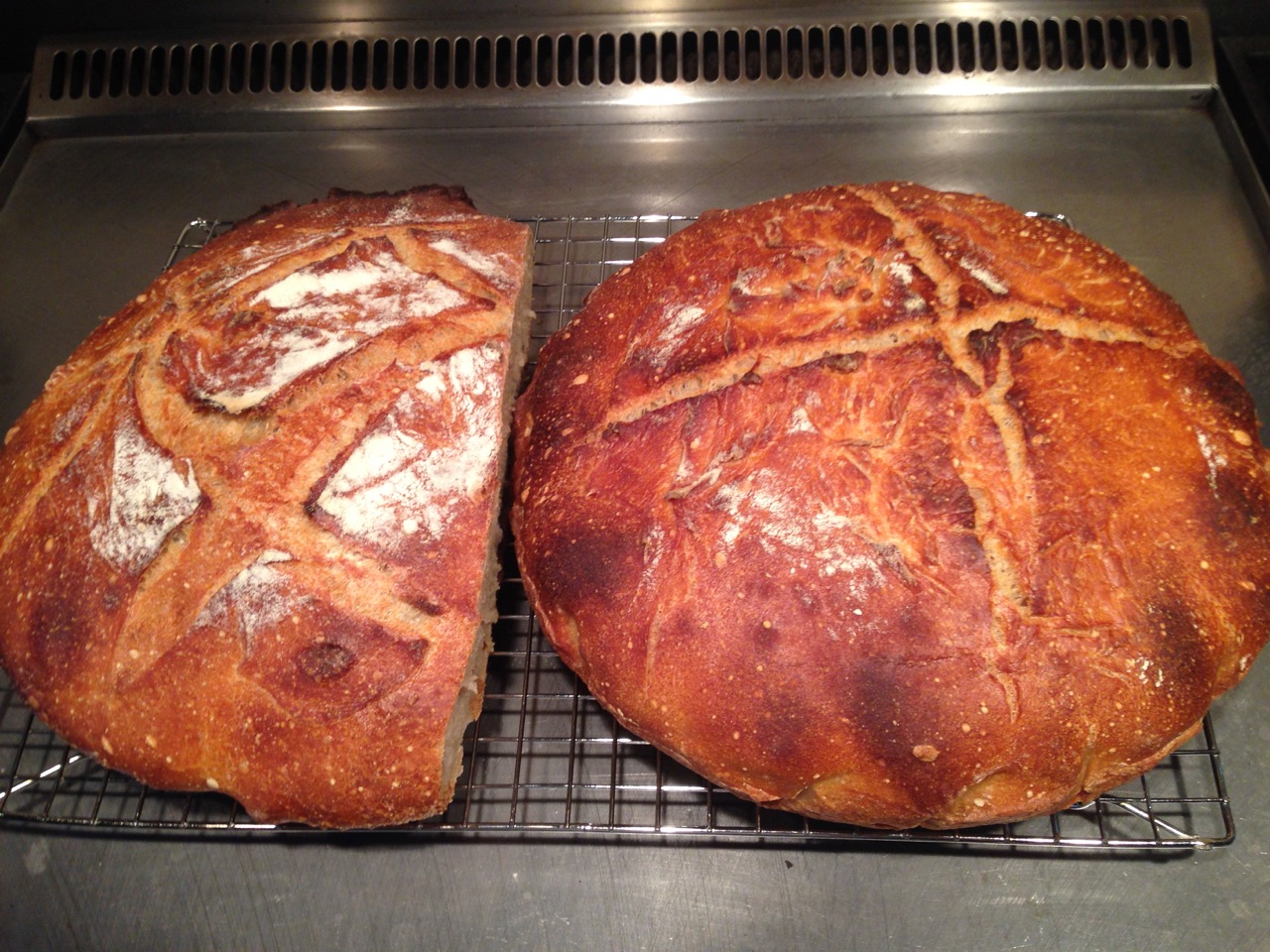 After a quite successful run this winter and spring, I've been struggling to decently shape my breads since the summer began. The bread I attempted to make today is a derivative of the Champlain Sourdough from Trevor Wilson. I "autolysed" overnight 850g of KA AP flour, 100g of Red fife, 50g of rye, 750g water and 20g of salt. The following morning, I added 100g of starter at 100% hydration (100% KA AP flour). I folded everything a few times to incorporate the starter. I confess I didn't kneed as he suggested. To compensate, I did 10 stretch and fold over the first 3 hours of BF and left the dough alone for its last hour. Total dough volume increased about 30 - 40% during BF. I did a quick preshaping after separating the dough in half and repeated my preshaping after 15 minutes as the dough wasn't holding its shape properly. I finally shaped the loaves and put them in banettons. Proofing for the first one lasted 45 minutes and seemed ok by the finger dent test. However, when I removed the dough from the banetton, I spread out and looked more like a pancake then a boule. I cooked at 450F covered for 20 min and uncovered for another 20 min. I did have oven spring but, as I expected, it looked more like a cake then anything else... The bottom part of the crumb was a bit gummy. My house temperature was a steady 75-77F during the day.