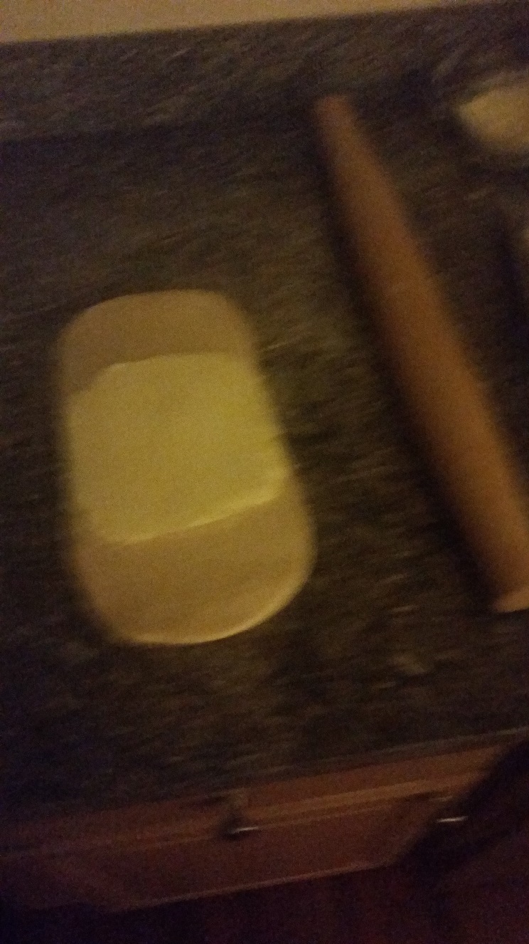 Very lightly flour the work surface - I use a three-fingered pinch of AP and flick my fingers, using 2-3 of these sprinklings to achieve a dusting sufficient for this first step - and place the dough on the surface. Lightly flour (in the same manner) both the dough and the rolling pin, and roll the dough out to about a 12-12.5in long, 5.5-6in wide square. It is very important that the dough be shaped with roughly 90-degree corners at this point, so as to seal the butter perfectly with no overlap.