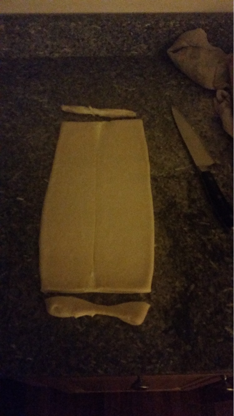 Remove the reserved dough and place it on the work surface. Roll it out to 1/8in thickness, taking care to roughly preserve a rectangular shape. Trim the dough on all sides, minimally, but making sure to expose the lamination at all points; make sure not to leave any part of the dough sealed by itself (by folds from previous steps in the process).