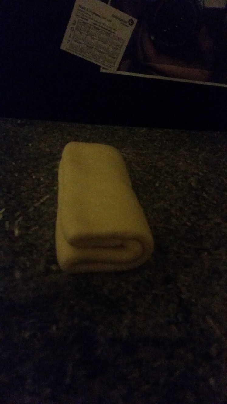 Fold 1 - the book-fold: I found that a 2/3 up, 1/3 down method (whereby the seam of the ends is trapped inside the fold) leads to a uniform thickness and no tearing at the edge during the second letter fold. Fold 2/3 of the dough up, and fold the remaining 1/3 down, letting them meet, then fold from the new top edge of the dough down to the new bottom edge - the seam created by the initial fold will be seen to be in the third big layer of dough from the bottom, in this book fold.