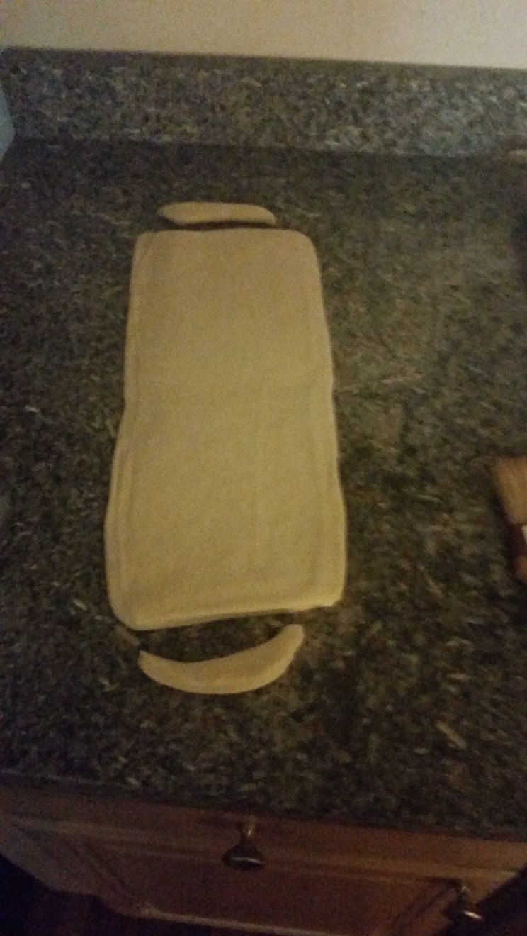 I shape the croissant by cutting 9in or 10in triangles, using the two-croissant-from-a-single-rectangle method, which allows me to avoid the two mini-triangles at either end of the dough that one ends up with by cutting the first edge of the first croissant at an angle. Even though by the laws of trigonometry this 2-in-a-rectangle method always gives the croissant triangle one edge that's slightly longer than the other, when you stretch the final croissant before shaping, it roughly evens out.