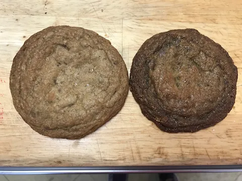 Also, I will just say, the test cookie on the left was baked right away from the dough and the one on the right was baked from frozen. Both at 350 in a blodgett convection oven.