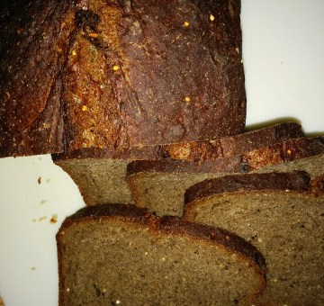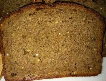The first loaf that I thought of to go with the Eclipse Challenge would be my “darkness” impression. I wanted a really moist and dark bread, heavy on the rye, but still enough of a “white” bread that my husband would enjoy it, too (he’s not as much of a fan of the dark stuff as I am). For the moistness and darkness, I decided on a porridge with lots of chocolate rye malt, and I used a mix of dark brewed coffee and Earl Grey tea for the liquid (an accidental mixture made by my husband helpfully saving some left-over coffee for me to have as iced coffee --- but adding it in to the container in the fridge that I used for left-over tea). I added in some sour cream and mashed bananas to keep the whole thing very soft, and just a touch of millet to be the “stars” in the darkness.