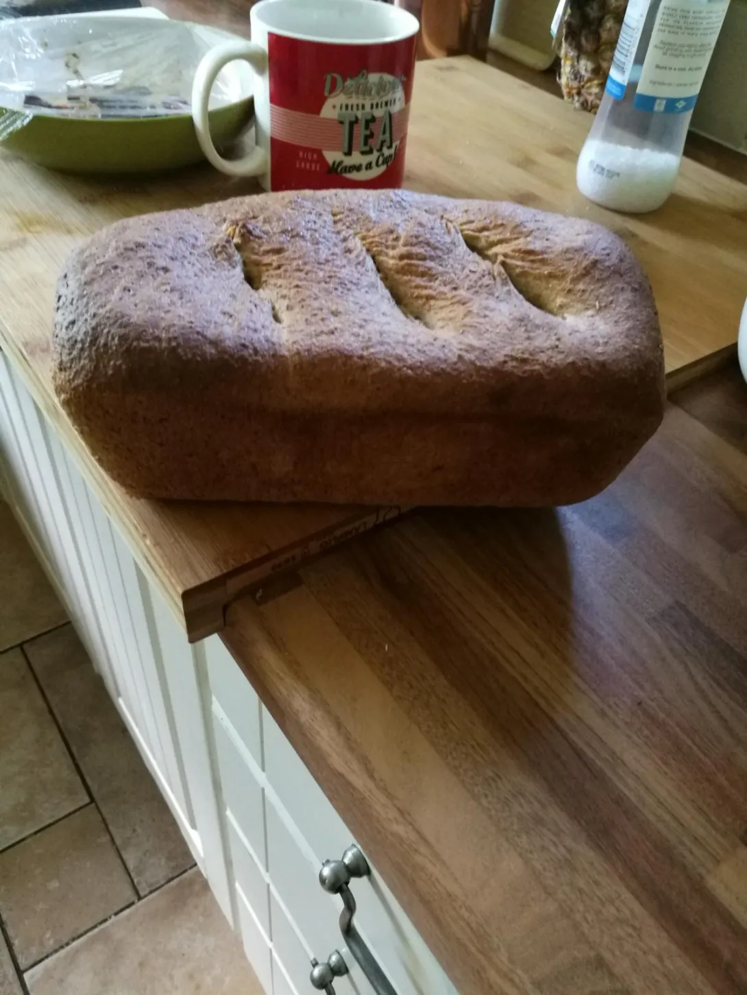 I wouldn't have scored that loaf once the proof gets close to full, you risk the chance of collapse, and with wholemeal even more so, it would have looked mighty handsome with a nice crest, perhaps with a dusting of flour over the top, I quite like using a bit of barley flour just for that purpose.