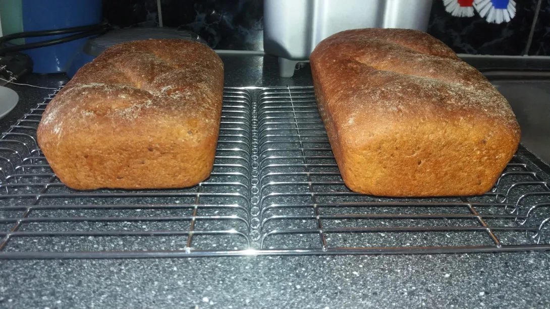 All ingredients put into the bread machine and put on dough cycle (in my machine that is 1 hour and 50 minutes). The dough was beautifully risen to the top of the bucket. I shaped the dough into two loaves and put them in sprayed tins. Covered the tins with a tea towel and left to rise for 1 hour. After that they were nicely puffed up just above the rim of the tins. Baked for 10 minutes at 190C (370F) and then 30 minutes at 175C (350F).