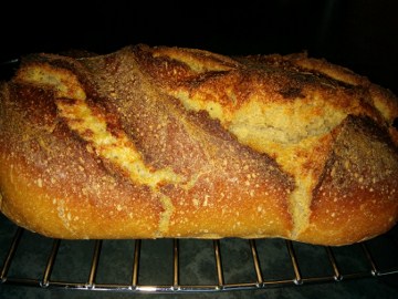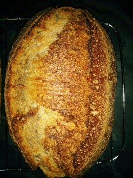 The second loaf proofed a bit longer (about 100 minutes after final shaping) and didn’t seem to dry out so much. I baked the same timing and it came out without all of the crazy cracks, a lovely flavour, and the same crumb.