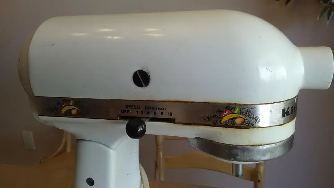 Hobart Kitchenaid K45 with fruit designs on metal band. Need help identifying age!