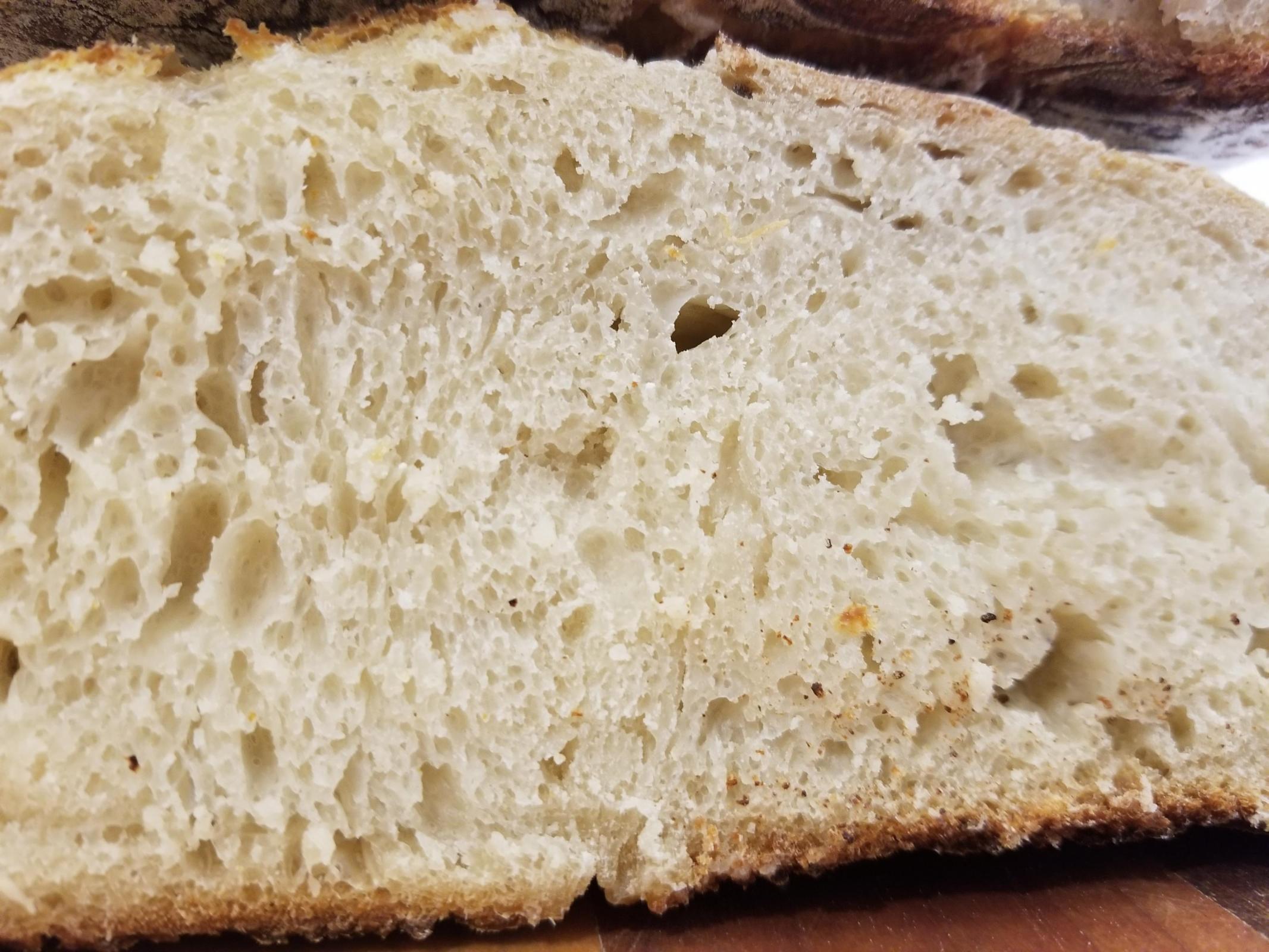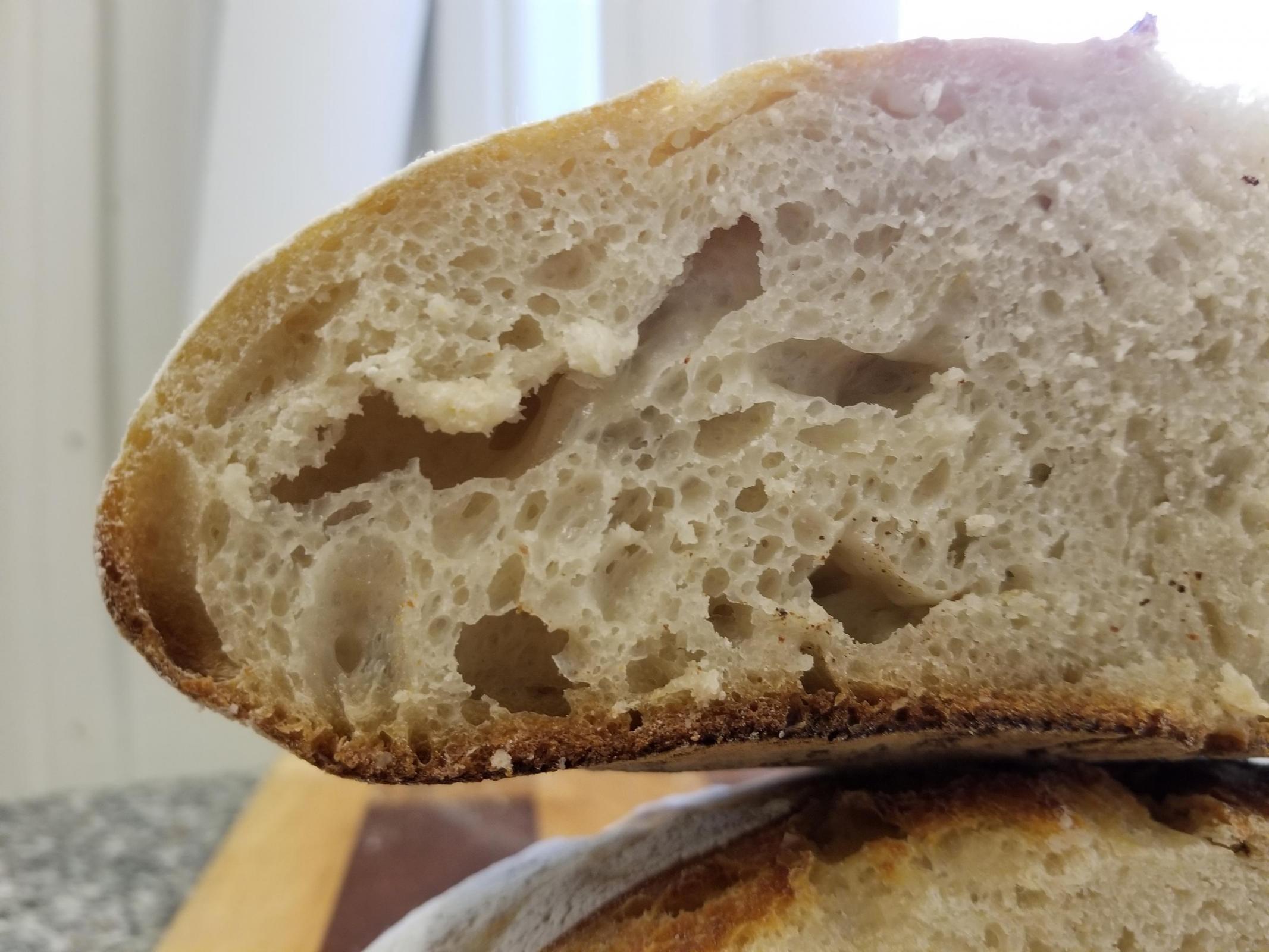 I think my starter wasn't quite active enough, so this spent about 15 hours on the counter for the leaven (with the flour/water added in 3 stages at 5 hours intervals). Then it spent 12 hours in the fridge after shaping. I still don't think it rose enough cause some parts are too close textured.