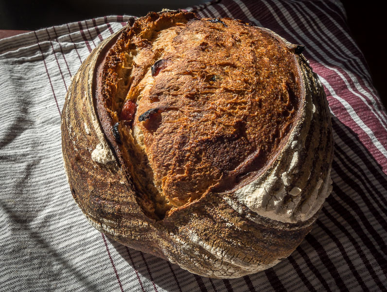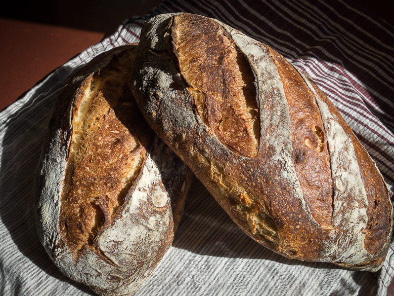 As for the color on the San Joaquin Sourdough, certainly part of the key is getting enough steam during the bake, and also having the right sugar content on the dough surface. If you are using a gas oven that is vented, capturing the steam by using a cover over the loaf is practically essential. You have probably read that the color comes from the Maillard reaction between water and sugars. The sugar is a balance of the fermentation - too short or underfermented and not enough starches have broken down into sugars; too long and the proteins start decomposing. Luckily for us there is a fairly long window of time.