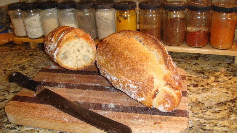The batards or baguettes are a different story.  Hydrations run around 72% ~ 75%.  Limited mixing/kneading and long bulk times of up to three hours or more.  With a couple of stretch/folds divided in the time.