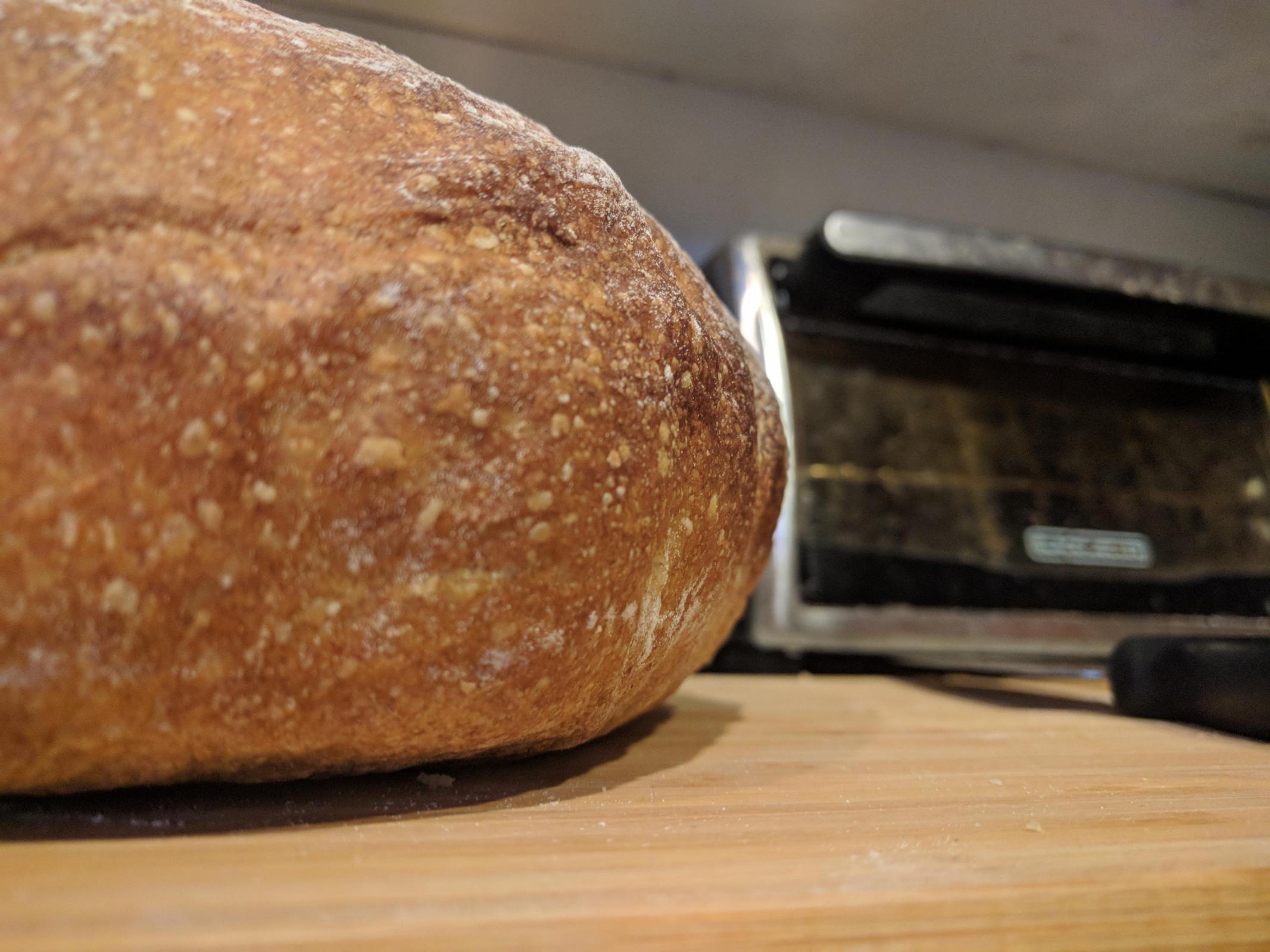 This one I only did 30 minutes, opting for a color that a majority of my audience would appreciate. Also I basically turned off the heat after the first 15 minutes as I was afraid that the crust was going to get too dark before the loaf was fully cooked. After cutting this morning, I find the interior a bit shy of what I consider fully cooked. But I just had a sandwich with a couple of toasted pieces and find it nothing to complain about.