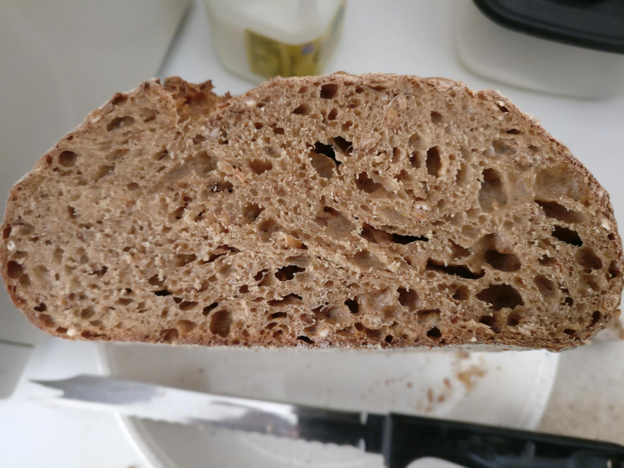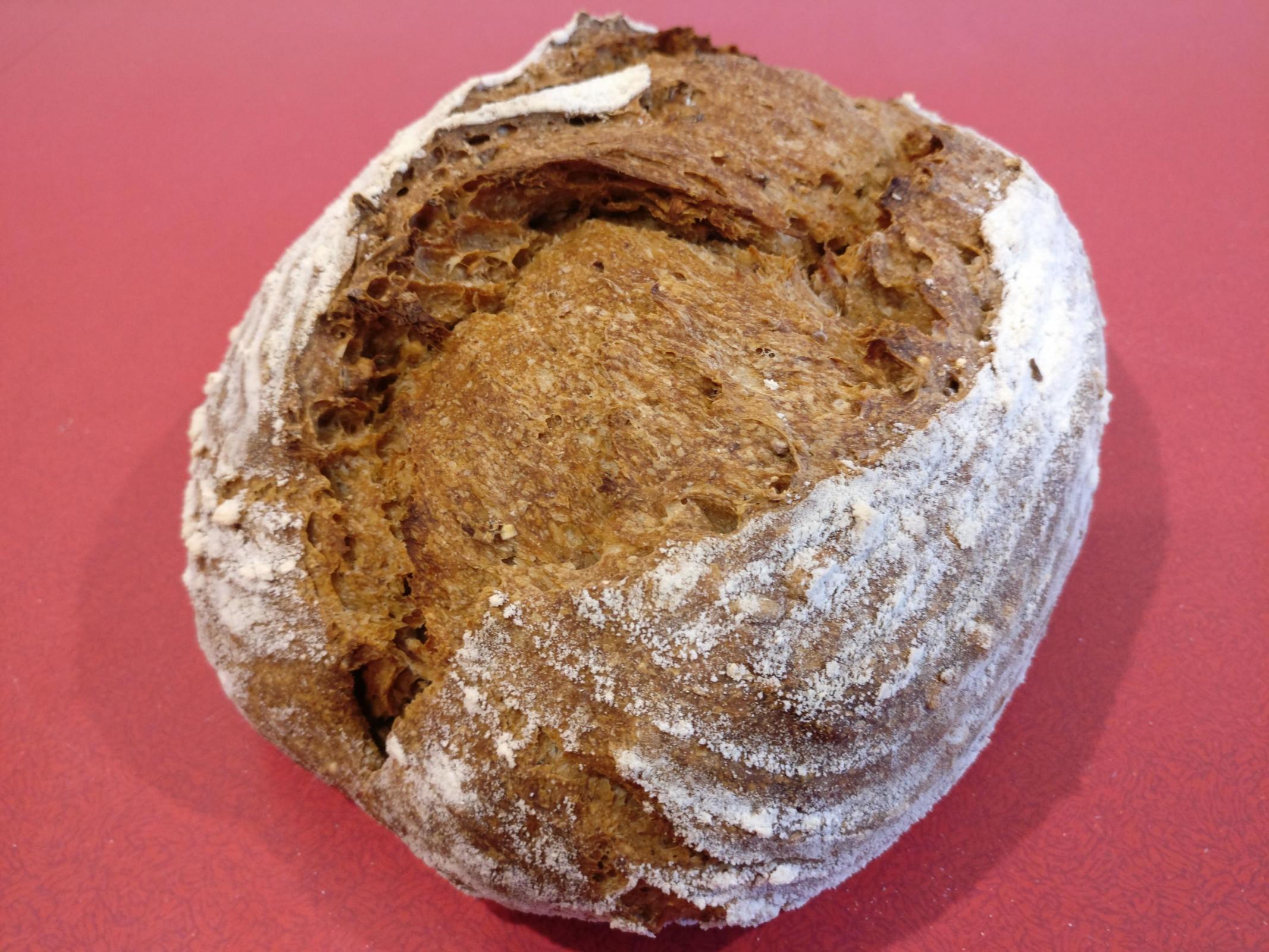 This one is a very complex flavour, I'm not even sure if it's not too complex. I used 300g of starter (mixture of rye and wheat) to compensate the chill in the kitchen, hoping to complete and bake in a day. It bulked on the counter for 9 hours then after shaping had another 3 hour proof. It's high proportion of rye shines through and the malted wheat and barley in the flour (Cotswold Crunch from F W Matthews), makes for a very intriguing taste.