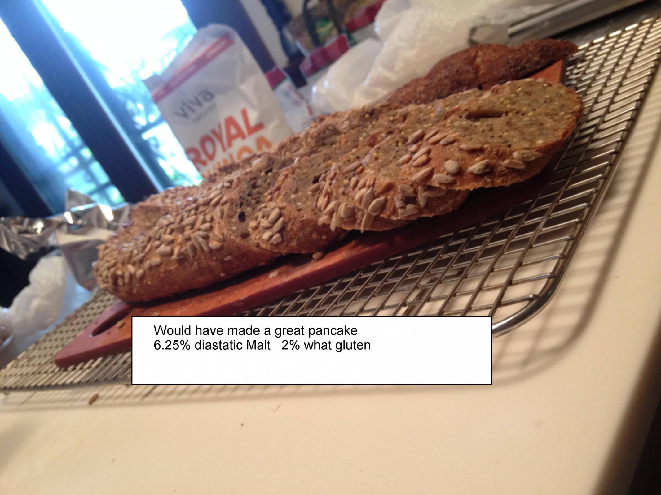 Hey, I just removed the last test loaf from the oven. NO PANCAKE! This bake didn't use any malt or gluten. I did ad 2 grams of SAF Gold IDY.I also upped the molasses from 1.84 to 3.6% and reduced the honey from 4.21 to 2.30%. NOTE, on the last 2 trials I used a Levain.