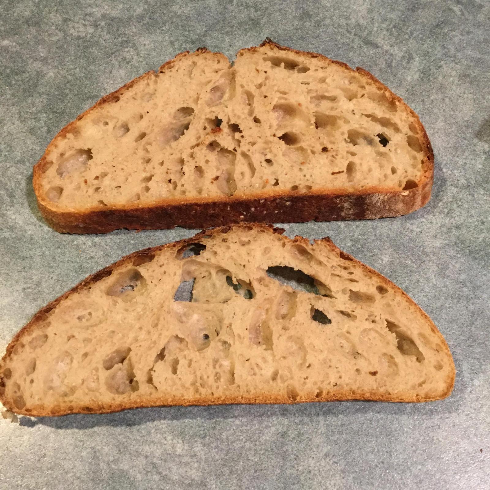 I was really disappointed with the shaping, proof and scoring. Quite down in fact. Before bedtime I gathered my courage and sliced 2 of the loaves. Wow, way better than expected (top slice) and even the double scored, lopsided loaf (lower slice) is not too bad. Went to breadwerx website to look at Trevor's crumb. mine is not at open as his, but for a first shot at this method, not too bad. I am encouraged.