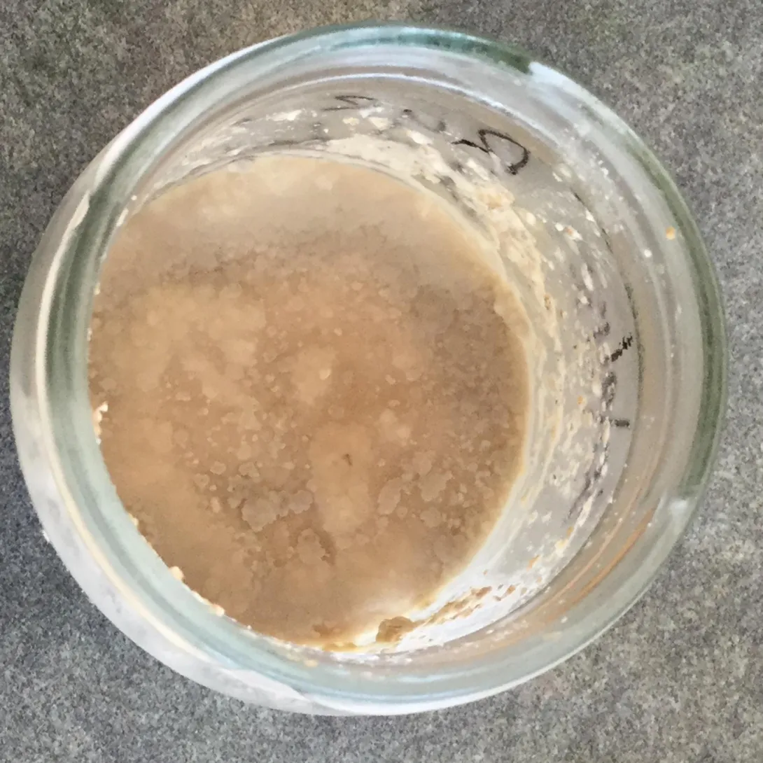 I brought a rye starter back from europe with me at the beginning of August. its been refreshed occassionally and used to bake with occassionally. About 6 weeks ago, I think although it might be longer, I went to refresh it. It smelt very yeasty and had a crust on top. I dug some out from underneath and rebuilt the rye starter. It is doing well, smells as I would expect etc. The rest of that starter was going to be flushed down the sink (only a small amount) so I filled the jar with warm water and left it while i did other things. I thought about it, decided I should hang on to it. So I went back and kept the rather soupy brew, drained off most of the liquid and put it in the fridge. This week I had another peek, and yep, now it smells very yeasty and the crusty surface is developing a greyish fuzz as you can see in the photo if you look carefully.