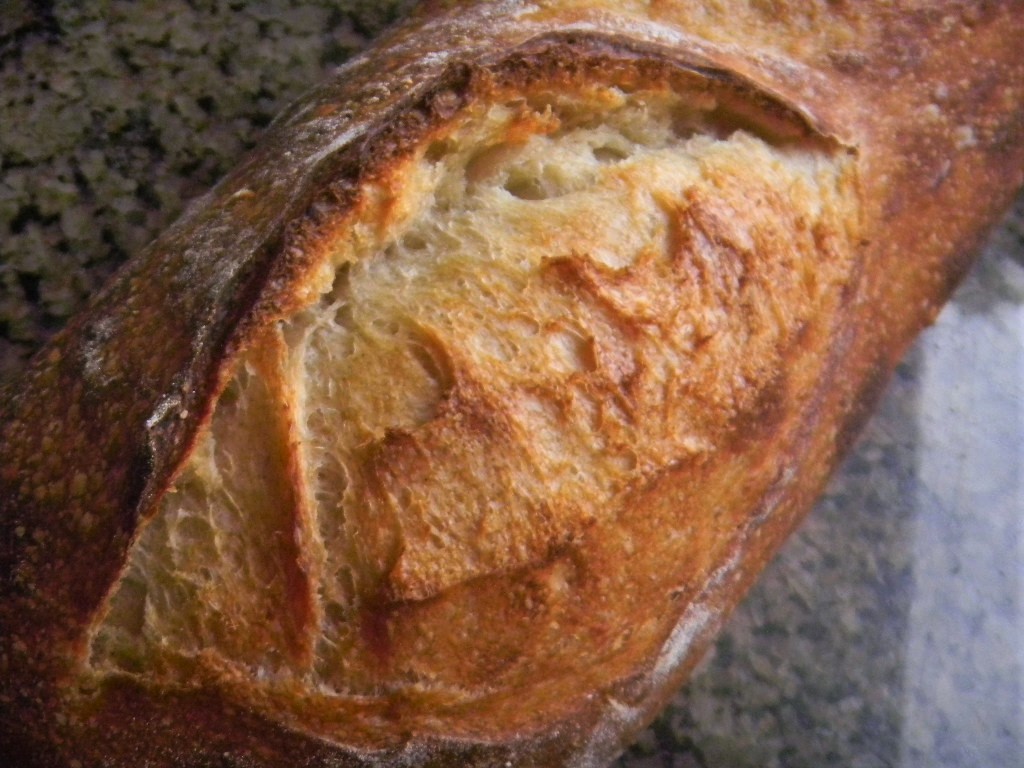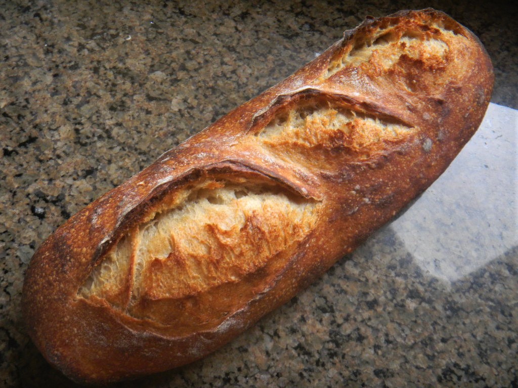 The dough warmed up for 2 hours the next morning before being shaped into a long batard. It was placed into a towel lined basket for 3 hours of proofing. Once the dough hit the 500 F bottom stone with Mega Steam it really bloomed and sprang well giving Lucy 3 big smiles with ears. We baked it bold and took it out at 209.5 F.