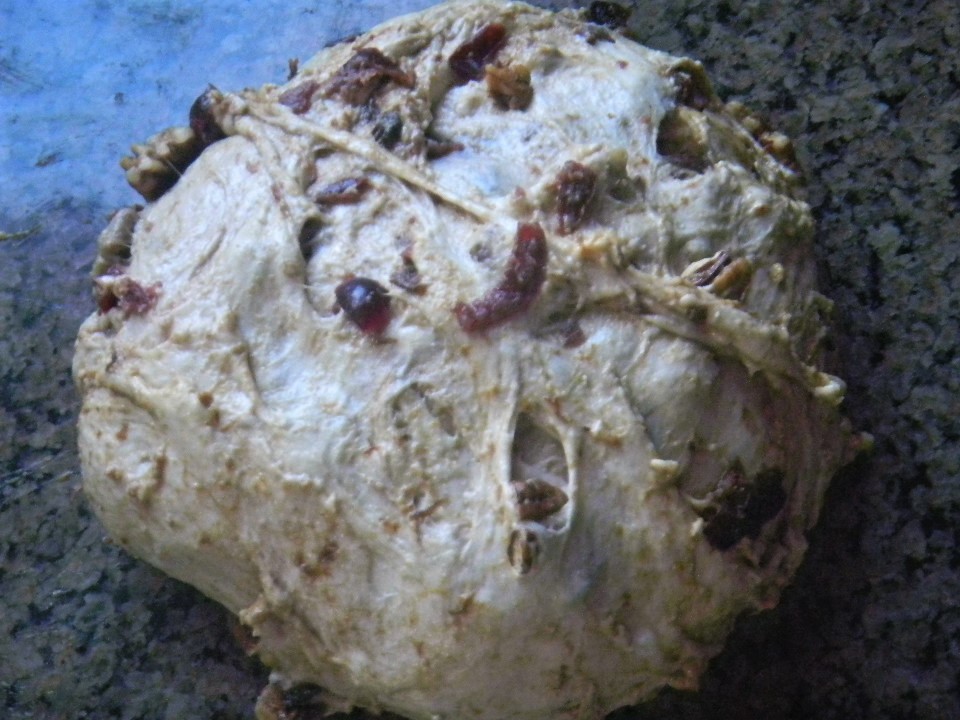 This one had a 10% preferment flour, whole wheat (white and red), 100 % hydration levain. Overall whole wheat was 25%. We did 1 set of 50 slap and folds and then 4 sets of stretch and folds – all on 30 minute intervals. The prune and cranberries were rehydrated with the liquid squeezed out and reserved to make yeast water. The fruits with the pecans went in during the first set of stretch and folds.
