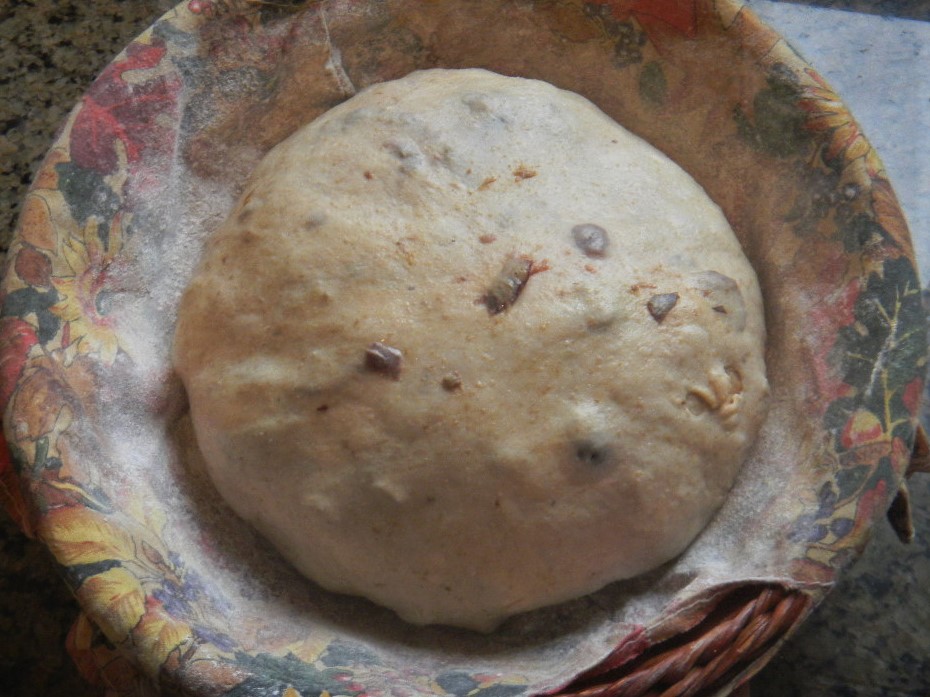The holiday bread bake was made for the centerpiece of the table but I forgot to Chacon it so I just dumped it into the flat bottomed, Goodwill 50 cent cloth lined basket, seam side down, hoping it would look nice. It came out unique enough for sure but, since I still have to bake a Chacon for the challenge holiday bake anyway, I decided to eat this one.