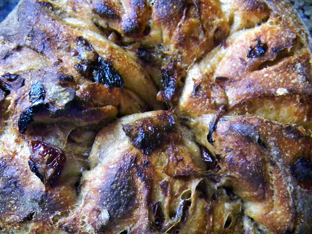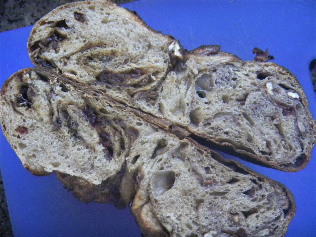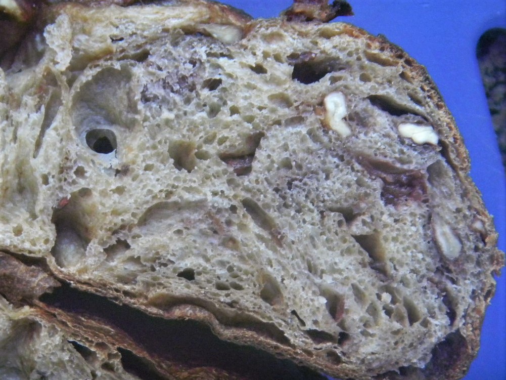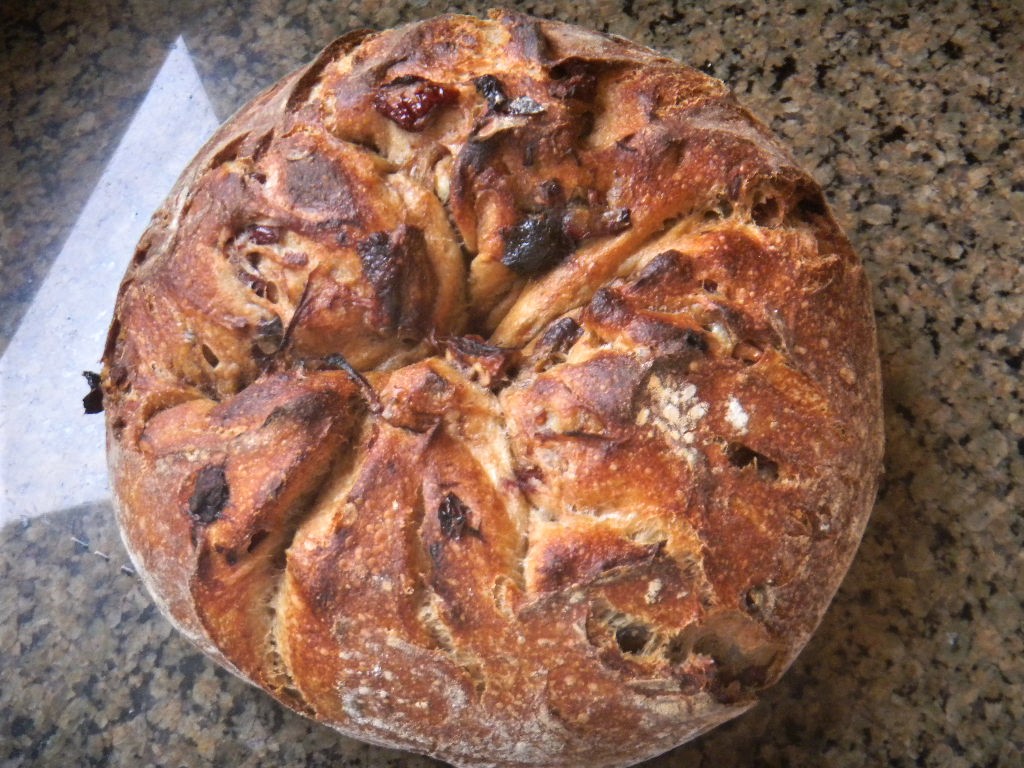 This started out at 80% hydration but the reh-ydrated fruits brought some extra water with them so it was quite a bit wetter than that in reality. We let it rest for 30 minutes before bulk retarding it for 14 hours. We let it warm up 2 ½ hours before shaping and basketing seam side down. It proofed for about 2 more hours before it hit the hot DO for 20 minutes of steam at 450 F and 15 minutes of dry convection air at 425 F