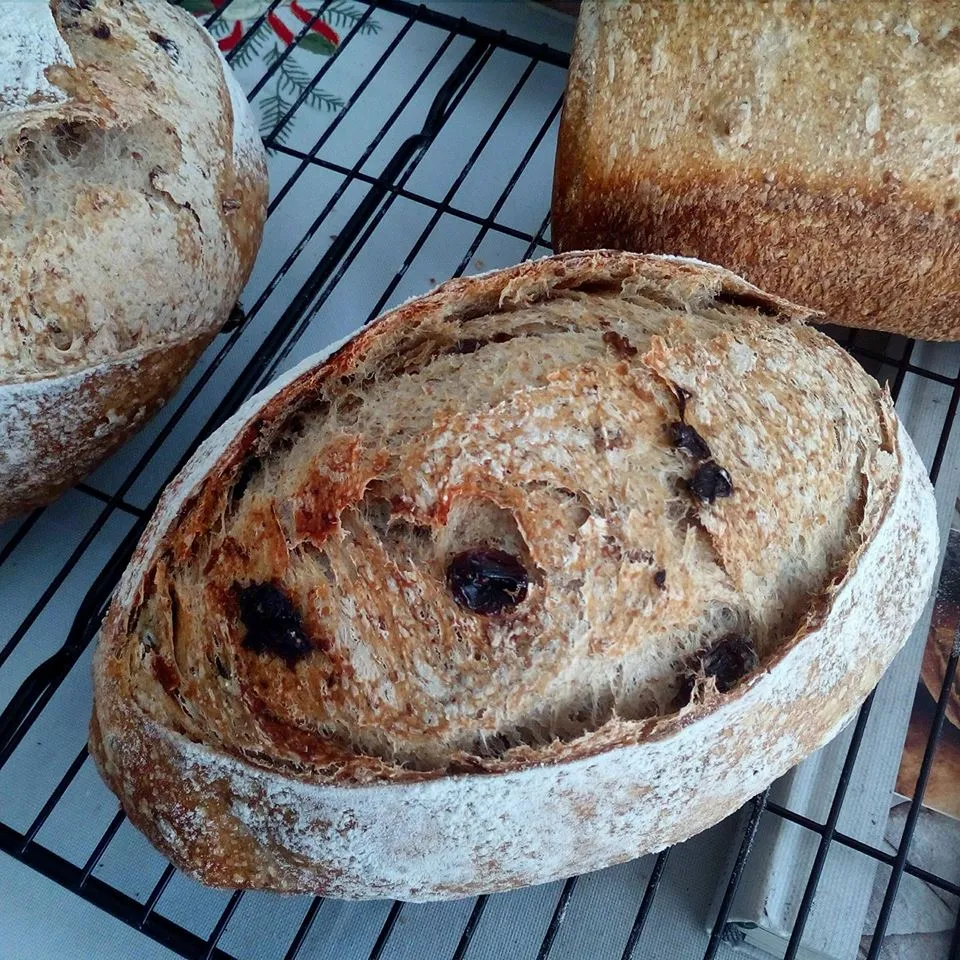 This was our Christmas bread. A combination of bread flour, stoneground red winter wheat and some barley flour. Levain and a lot of raisins, granola and some spices.