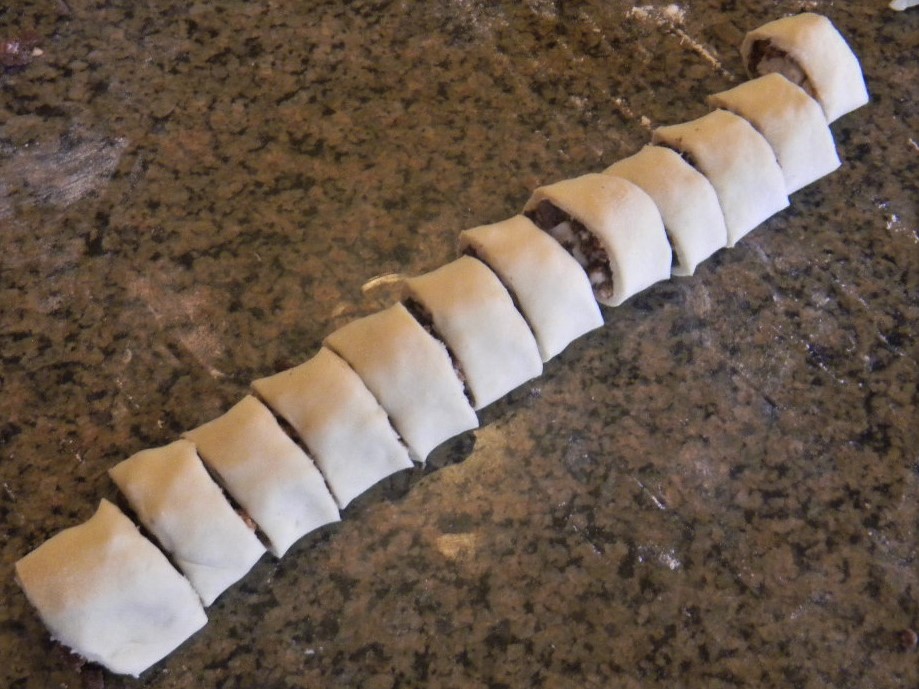 Half of them had a chocolate chip and pecan filling; 3 oz of chips and 1 oz of pecans, with a bit of cinnamon, sugar and 1 T of softened butter. The other 12 were; hazelnut, chocolate chip, same ratio as above, 2 T of peanut butter with 1 T of sugar and 1 T of butter. We think both will be tasty if Lucy doesn’t eat them all! She looks very hungry!