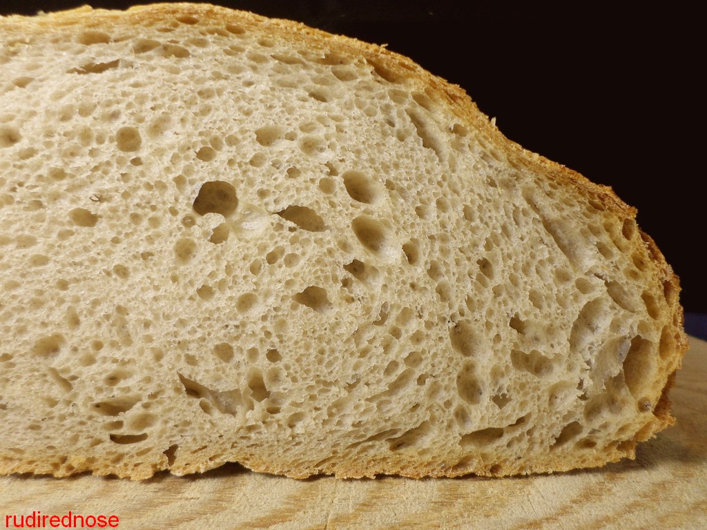 Crumb shot shows perhaps a touch underproofed. I expected a bit more flavor but it was actually a bland tasting bread, esp. after the lovely scent of the biga. The crumb was typical of bread made with high protein flour and I may try AP flour next time, as a personal preference.