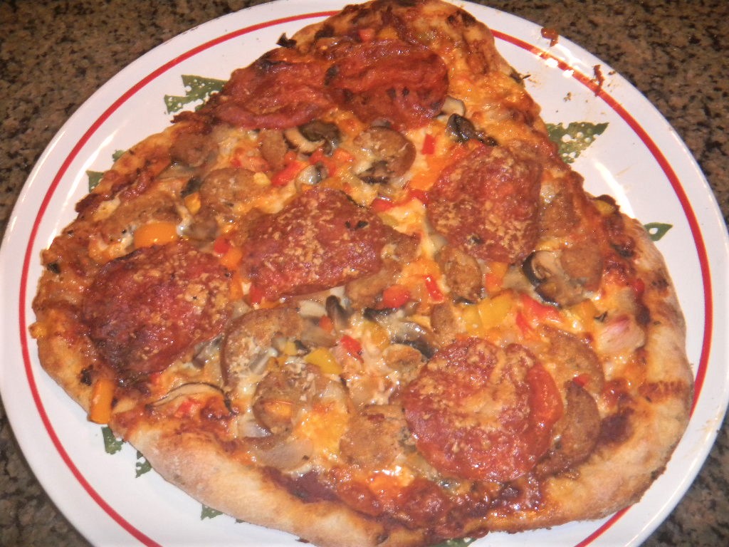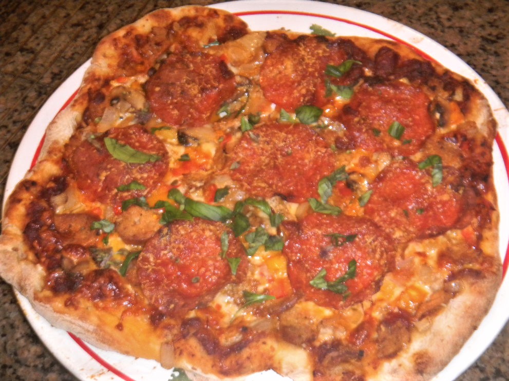 pepperoni. She snatched it out of the air as I threw it to her. She always gets the first bite of just about everything made around here. We need someone to make sure this stuff isn't poisonous! The pies weren't mis-shaped. MY new SIL actually did a commendable job of shaping them but I forgot the bottom stone was cracked and they sort of stuck themselves into the crack and ,when I went to spin the pizzas at the half way mark, they were manhandled by one pissed off oven tender:-)