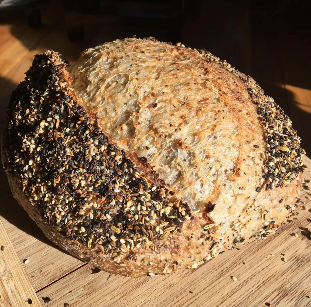 Naturally Leavened seeded sourdough with chia, golden flax, and hemp seeds. Crusted with everything topping. Nutritionally dense and packed with flavor.