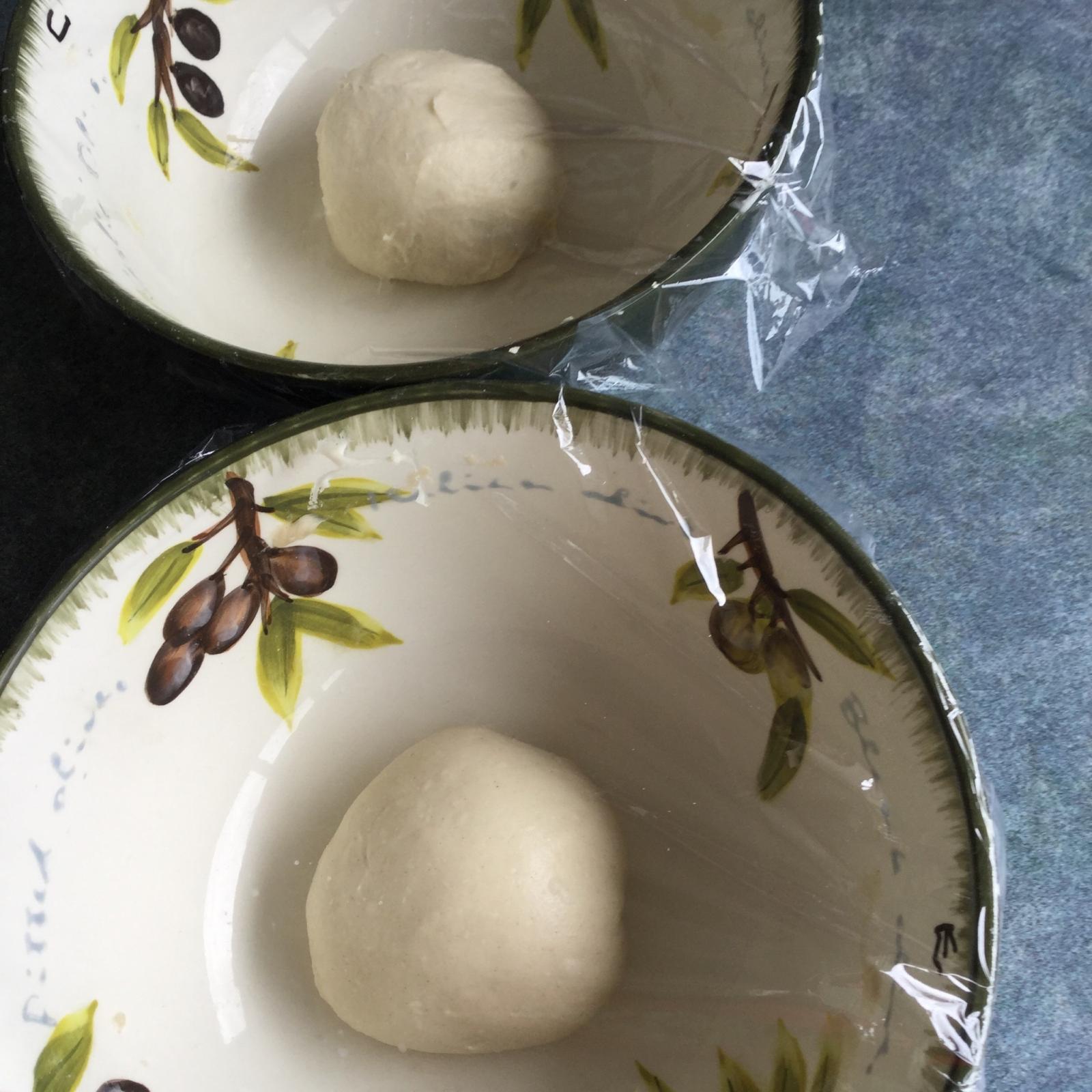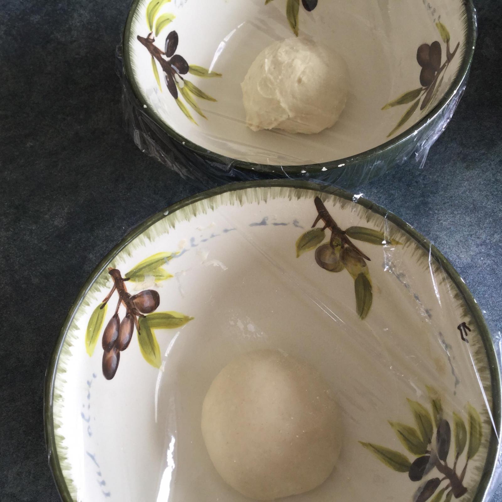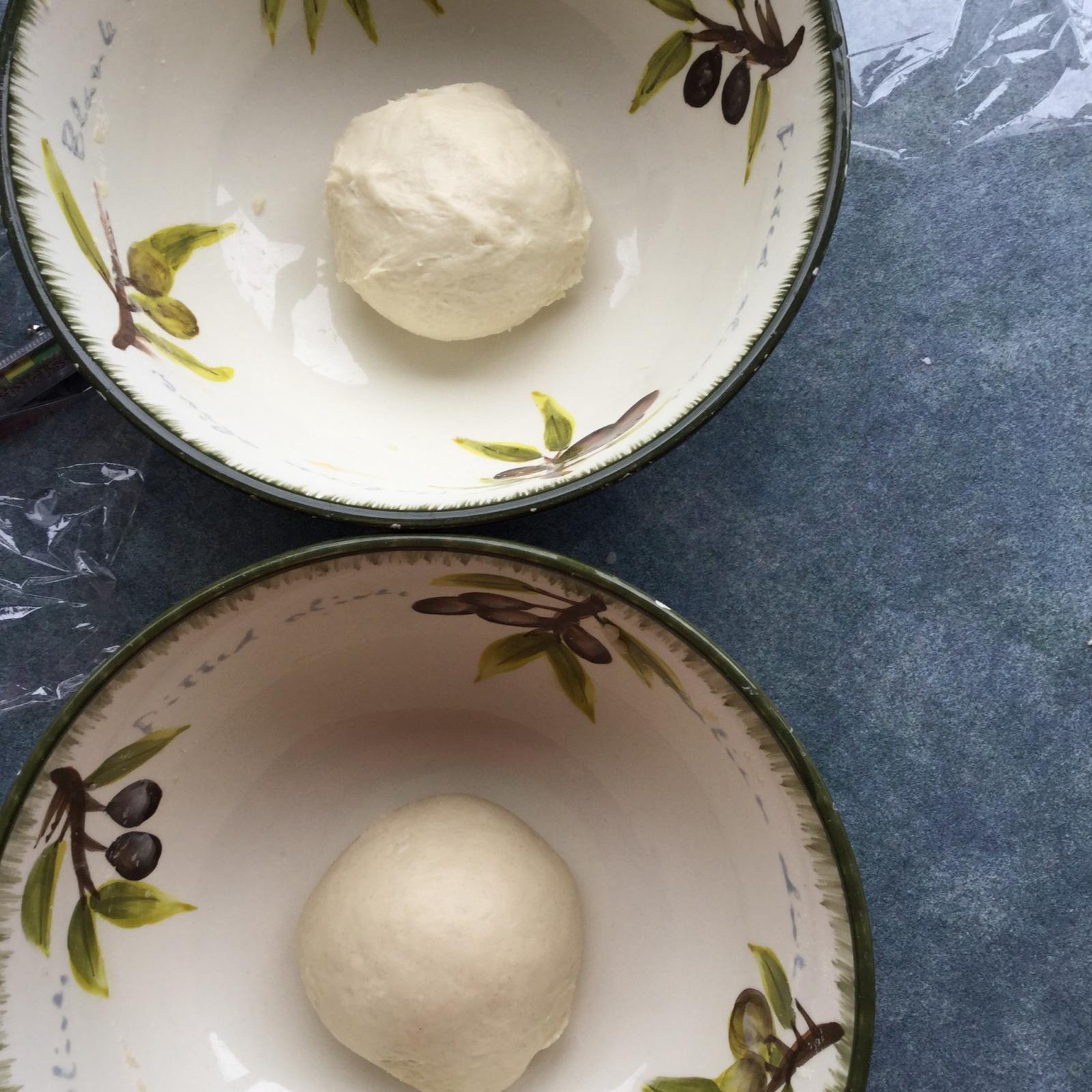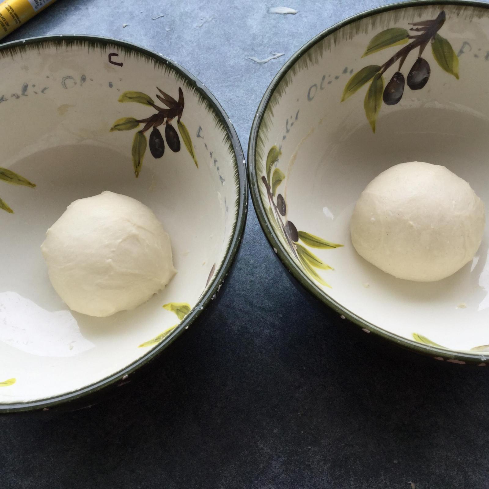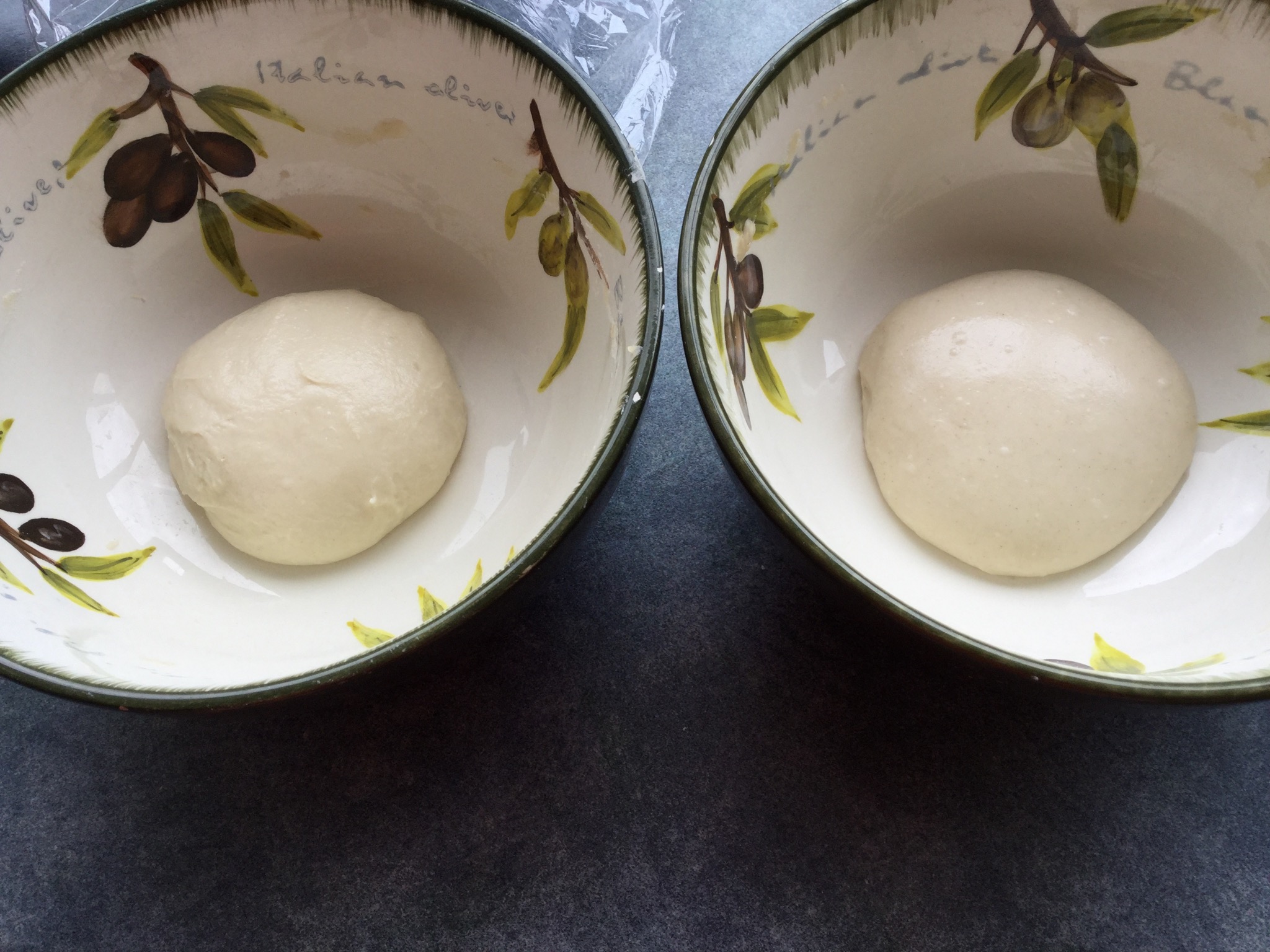 #3 50 stretch and folds each really just using finger tips in soup bowls. covered and left again. dough C (top bowl) is stickier and not as smooth