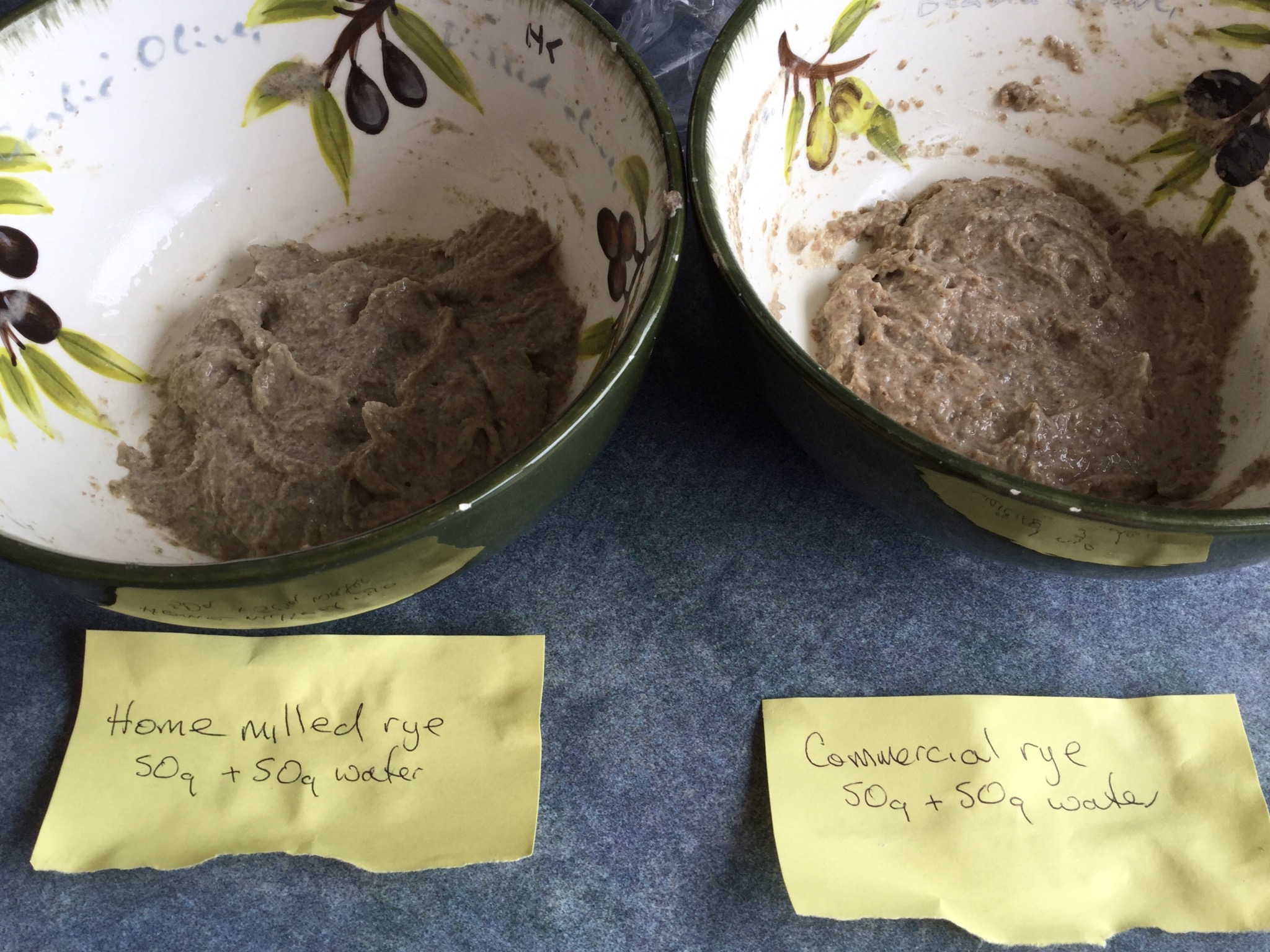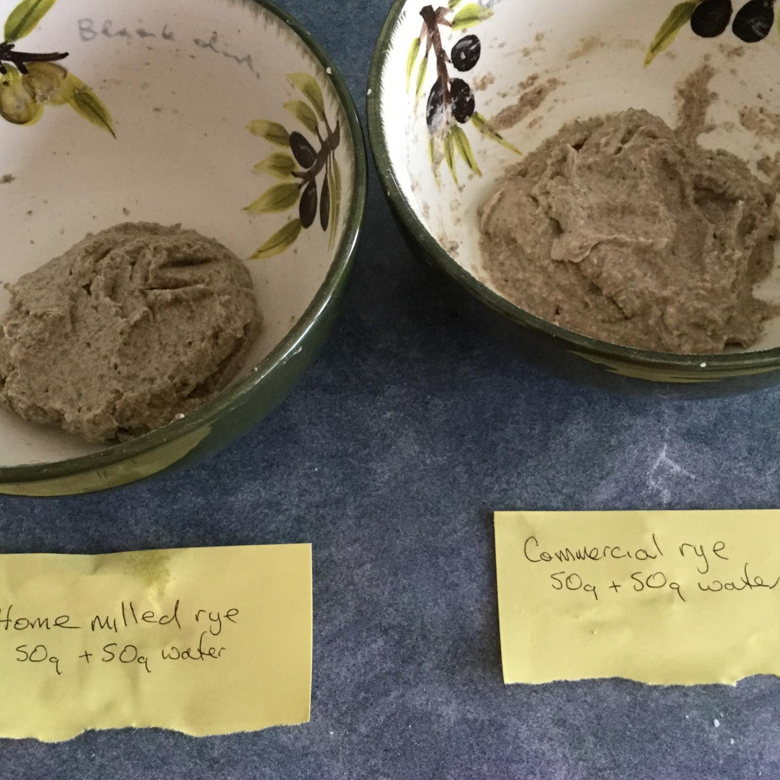 I milled 50 g rye berries and mixed with 50 g water. the dough was soft but a bit firm. I then weighed 50 g commercial rye flour and mixed with 50 g water. it was wet and soft. Covered bowls and left for an hour.