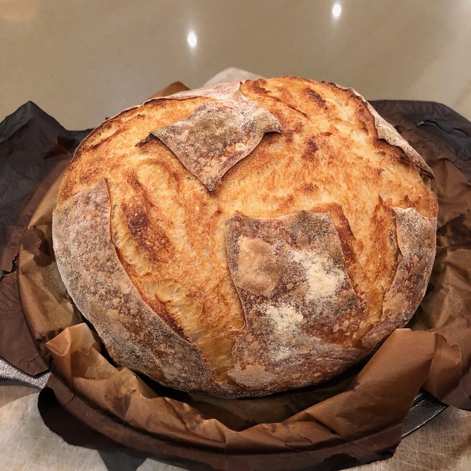 I mixed the flour, water and salt Friday night, left it on the counter for a few hours, placed it in the fridge. Saturday morning I took it, added the levain, mixed it for ten minutes to incorporate and left it in my 'warm spot' cupboard (78 degrees). I folded it three times within the first two hours, then every hour until about 4pm. The dough started moving, I placed it in the fridge as I had to run an errand. At this point it had probably increased about 30/40% in volume - Trevor likes to get a 30% increase to this point if I read it correctly. An hour I was back, took it out of the fridge, and per-shaped and left it on the bench for about 20 minutes. It had very good structure and shape. I did a final shape, put it in the basket and let it proof in the warm spot. It went up about 30/40% in volume and then I baked it per his direction of 20 minutes at 550 and 20 uncovered at 425. I normally don't bake that high.  I bought a lodge combo cooker during the holidays so this was my first bake in it.