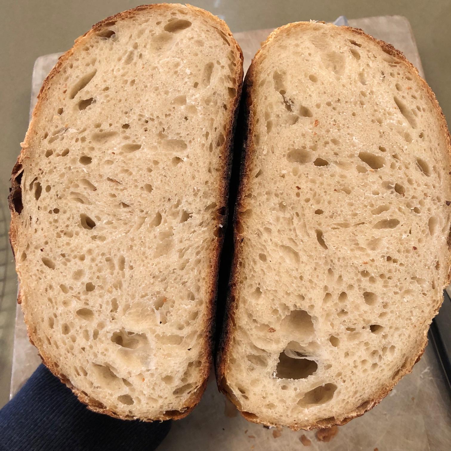 It's a fine tasting bread and is fine in many ways (ex the bottom burn). But It's not what I'm after.  I can't help but think I under proofed. Not yet the OPEN crumb I'm looking for.. will try again next week..