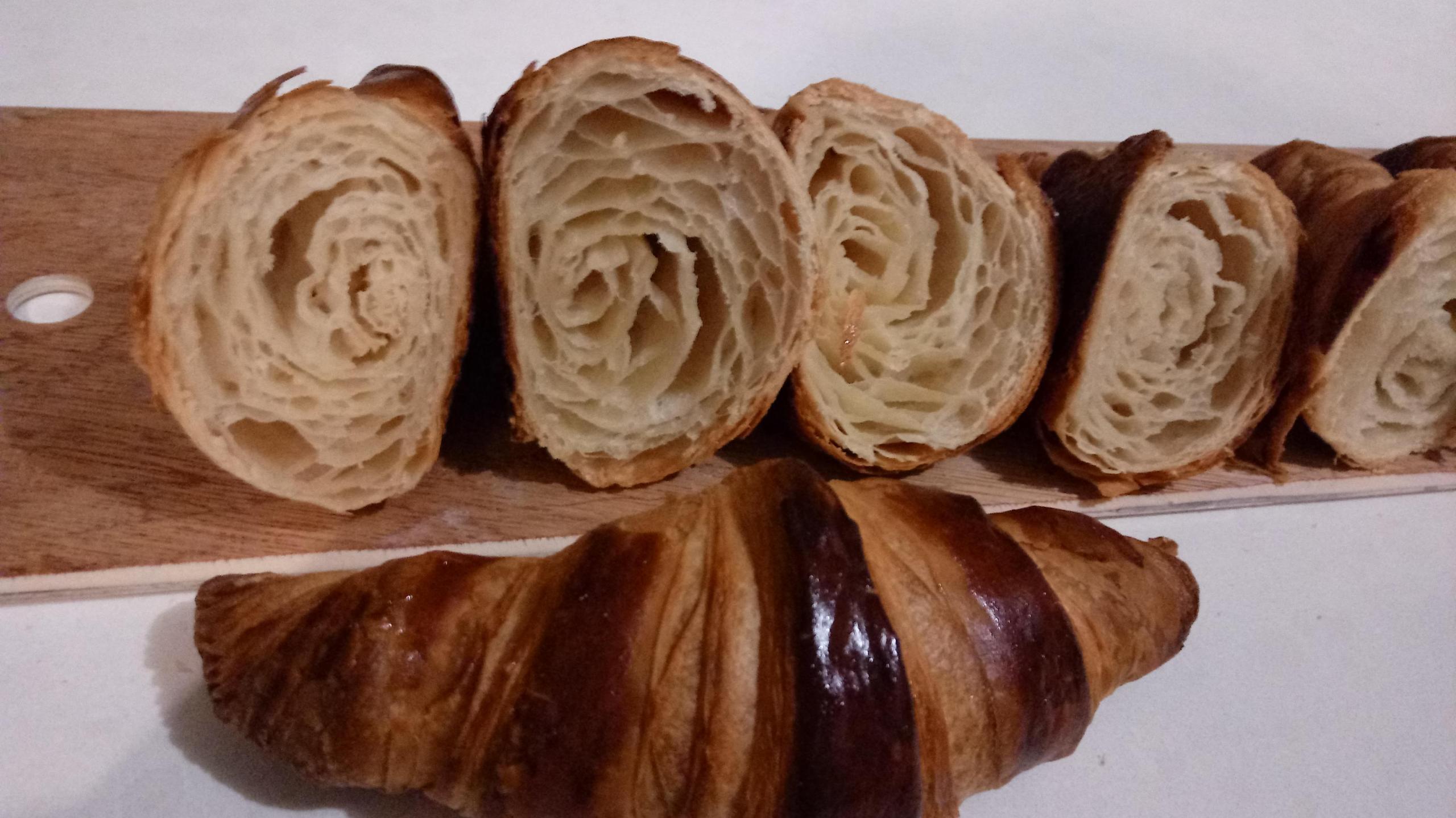 After many agonizing croissant batches here's a bake I can say I'm pretty happy with. I'm finding that sourdough croissants are a little more fun than their commercial cousins. These like the last batch I did were inspired by txfarmer farmer using a blend of her techniques and Louis lamour (youtube baking artist extraordinaire). I mixed mixed in about 10-20% rye starter into my levain and let that sit for about 4 hours - this time the dough was considerably more sticky and took much longer to bulk up than usual and entire experience was much different - lamination for example required addition freezer chills. There's something about a wild yeast starter that just gooifies dough bit in this case seems to have really helped with the 'honeycomb' style crumb most croissanteurs strive for. The very first batch of croissant ... 6+ months ago was like looking at white bread and slowly (with some steps forward and some steps back) these suckers just like bread begin to do what you want. Now the question is can it be repeated ?