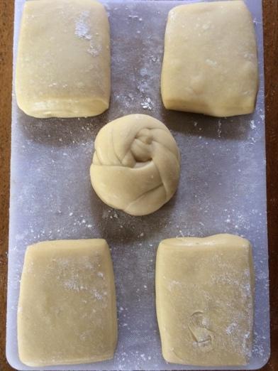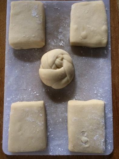 The dough was simply tipped onto a cutting board; edges trimmed; and cut into 4 pieces. I braided the trimmed edges as to not waste anything and fashioned it into a roll. I proofed them for an hour because they came straight form the fridge.