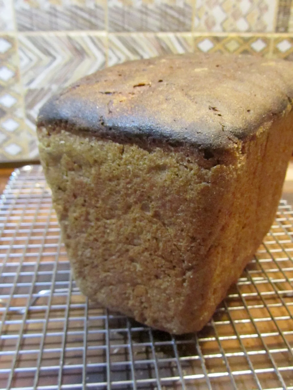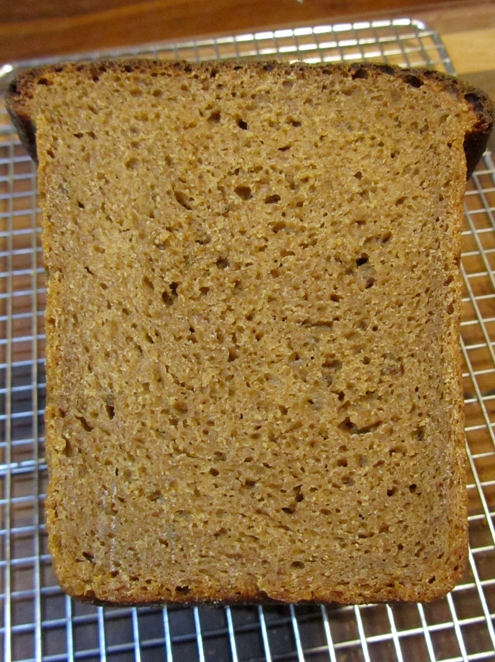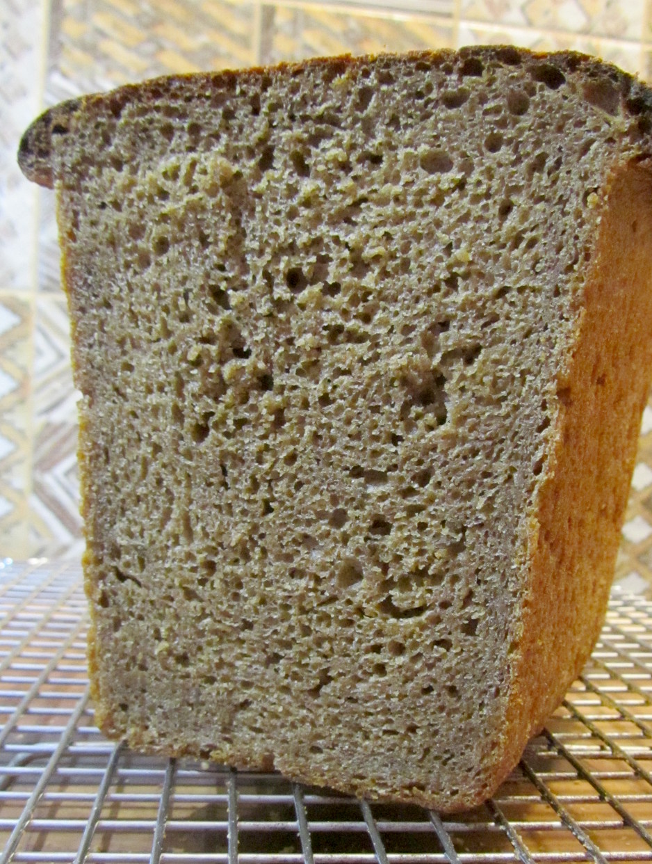 In an attempt to reproduce the rye bread from a local farmer's market I baked this bread. It is a four-stage sourdough bread, 70% dark rye, 30% whole wheat, 72% hydration, 1.8% salt, 2% molasses, 0.1% instant yeast. 30% of rye flour is scalded (5 hrs @ 155 F) together with baker's 5% of a 2:1 mixture of white and red rye malts. The final dough had developed some gluten after mixing/kneading, not much though. This bread tastes great; however, I think the bread from the market has less rye in it and more gluten.