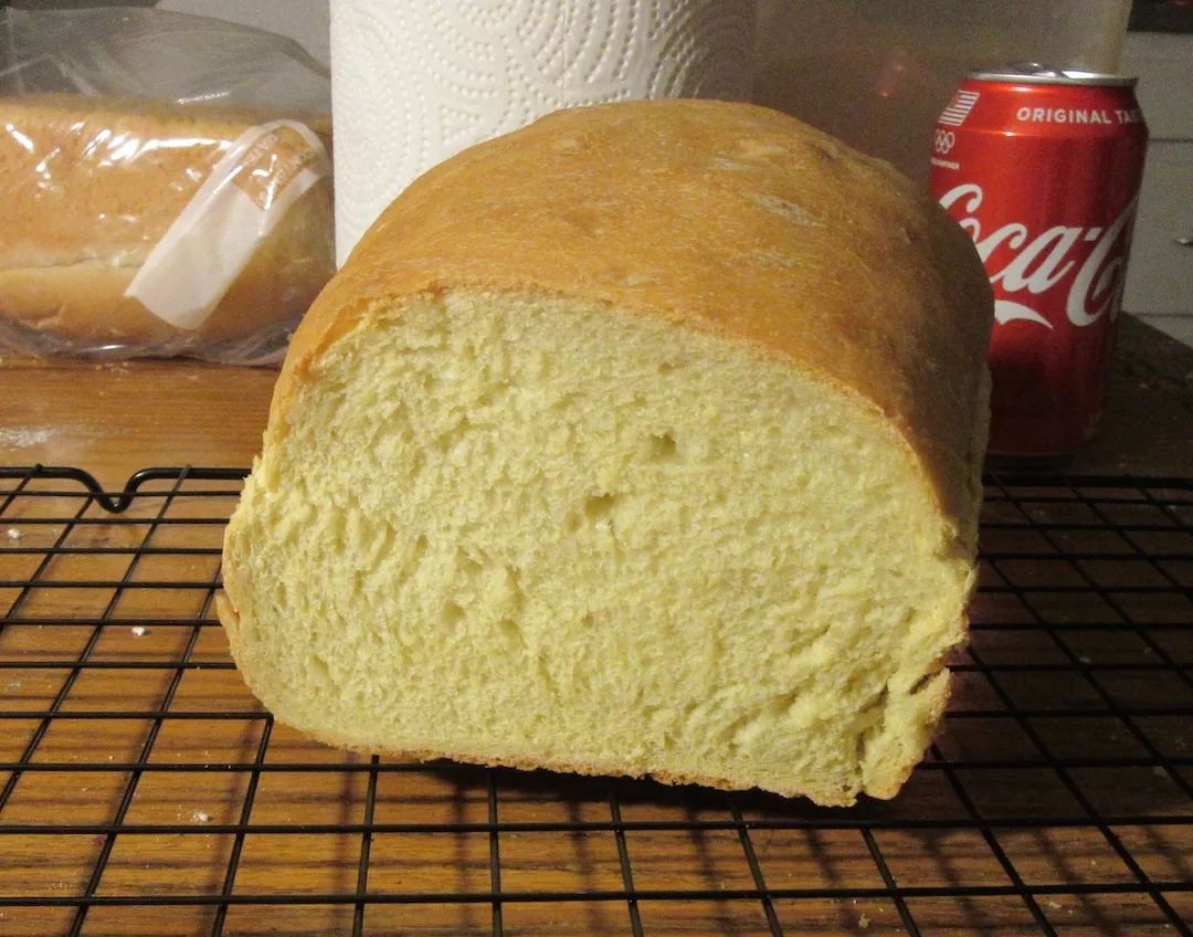 Results. Again the autolyse was mechanically perfect. Had windowpane after three hours. I did have to knead four or so times instead of stretching the dough each half hour because of the lower hydration. Using less yeast preformed as expected. Very nice rise. The structure of the bread is again what I'm looking for. Even and small. Now for the taste. This bread smells and tastes like bread. As long as it's flavor doesn't change tomorrow I'm calling this a complete success. Again the autolyse preformed perfectly with fat. This time four tablespoons of crisco. The only differences in ingredients was a stiffer autolyse, less yeast and no buttermilk powder.