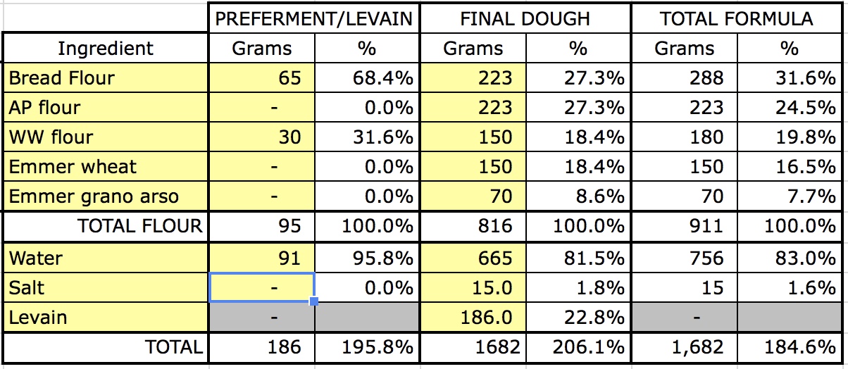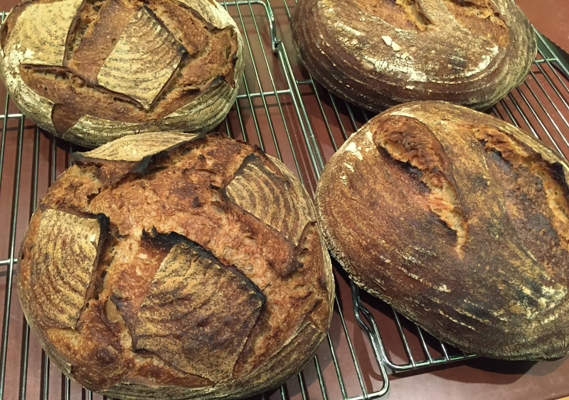 The two loaves on the left of this photo are made with grano arso. The other two are basically the same formula using einkorn flour that I made in case the first ones didn't work out.