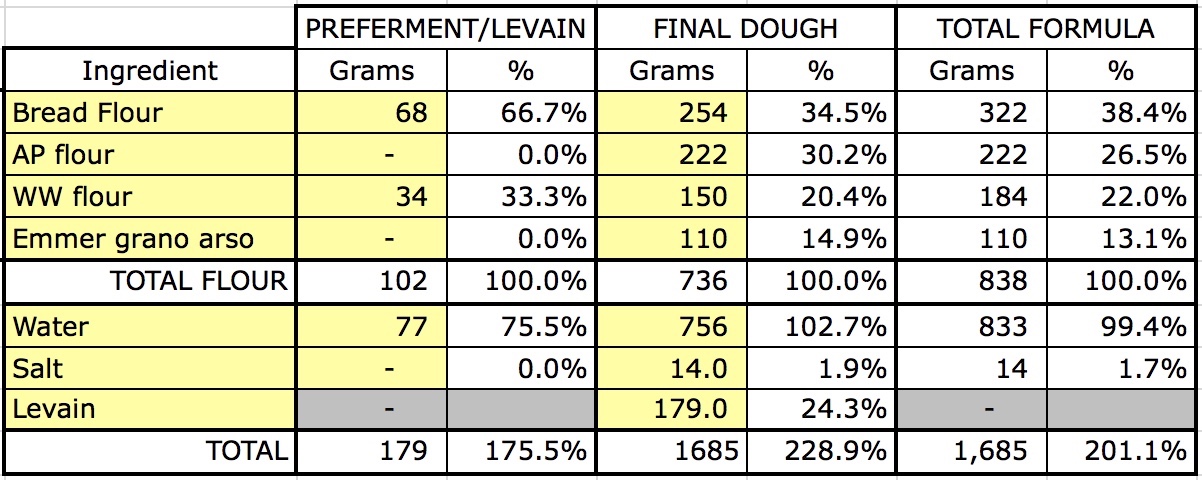 For the next attempt I reduced the hydration a bit and also reduced the grano arso to under 8% to make the flavor a bit more in the background. This worked flavor-wise: the burnt flavor was more subtle so it paired well with more foods. I kept the salt low for these first bakes, but I think the grano arso can take a fair amount of salt, maybe up to 2.5%.