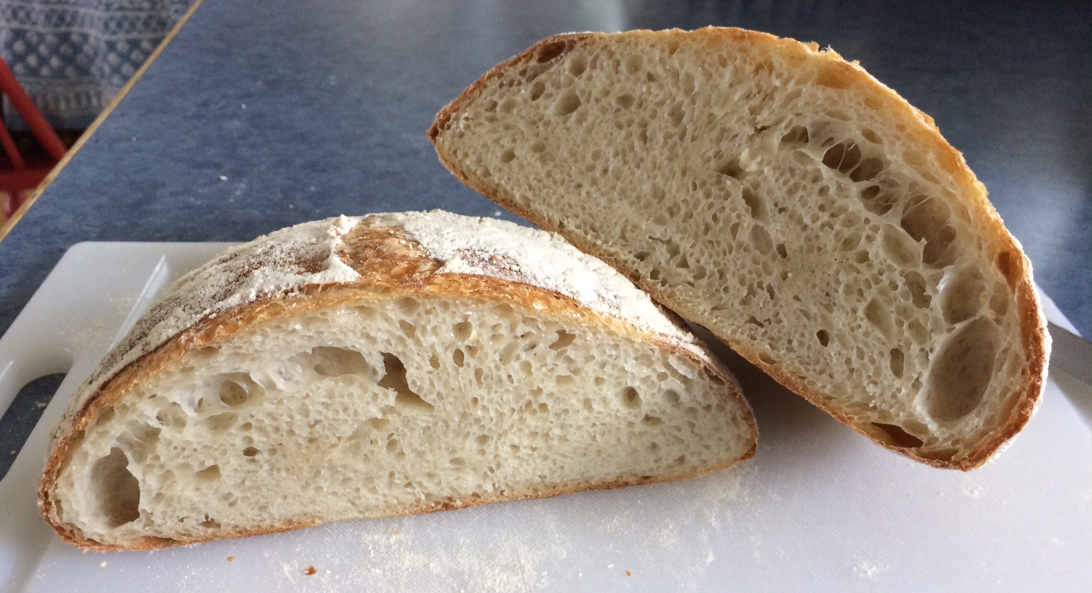 I followed the same procedure today for the larger loaves (200 grams of starter), but there is a distinct difference in the crumb.