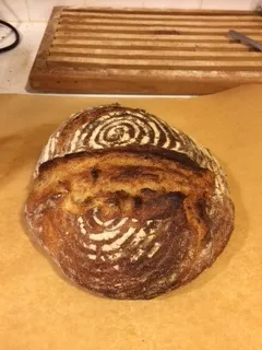 In trying to figure out what bread to start my son off with several people here suggested Jim Lahey's recipe. I wanted to try it b/f helping out our son so i made a loaf about a week ago and was very pleasantly surprised. But I found the amounts skimpy for a Dutch oven, so I scaled it up a bit and got a really beautiful loaf. It's was a gift so I have no crumb shot of that, only of last weeks iteration. I added more Golden Buffalo to this version and cut back to 71% the hydration b/c my AP flour for this loaf was T65.