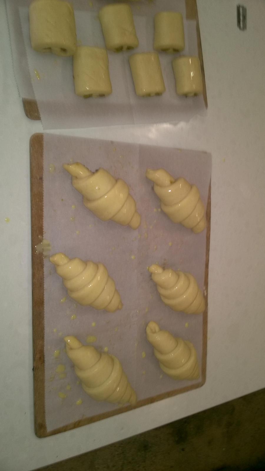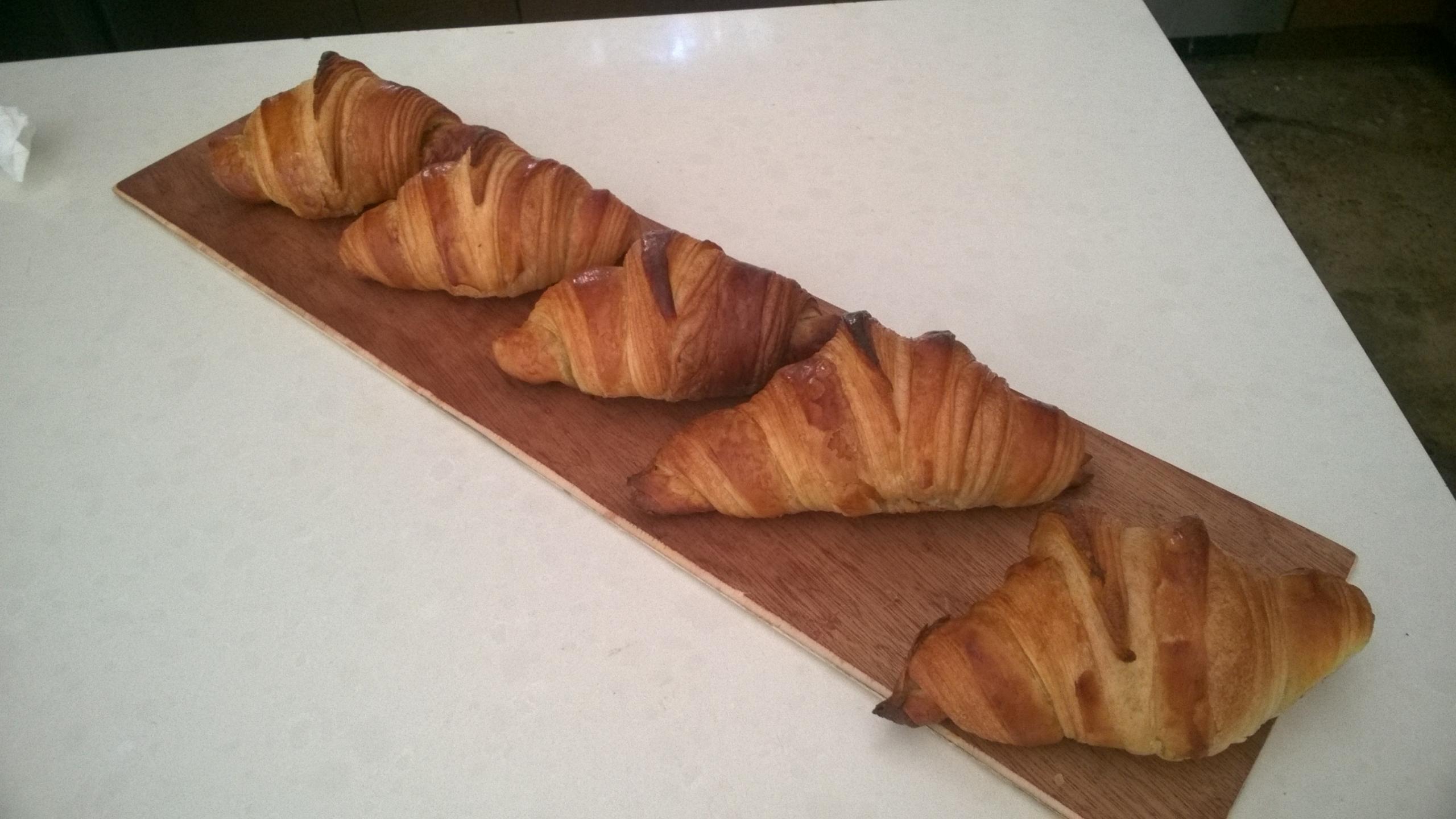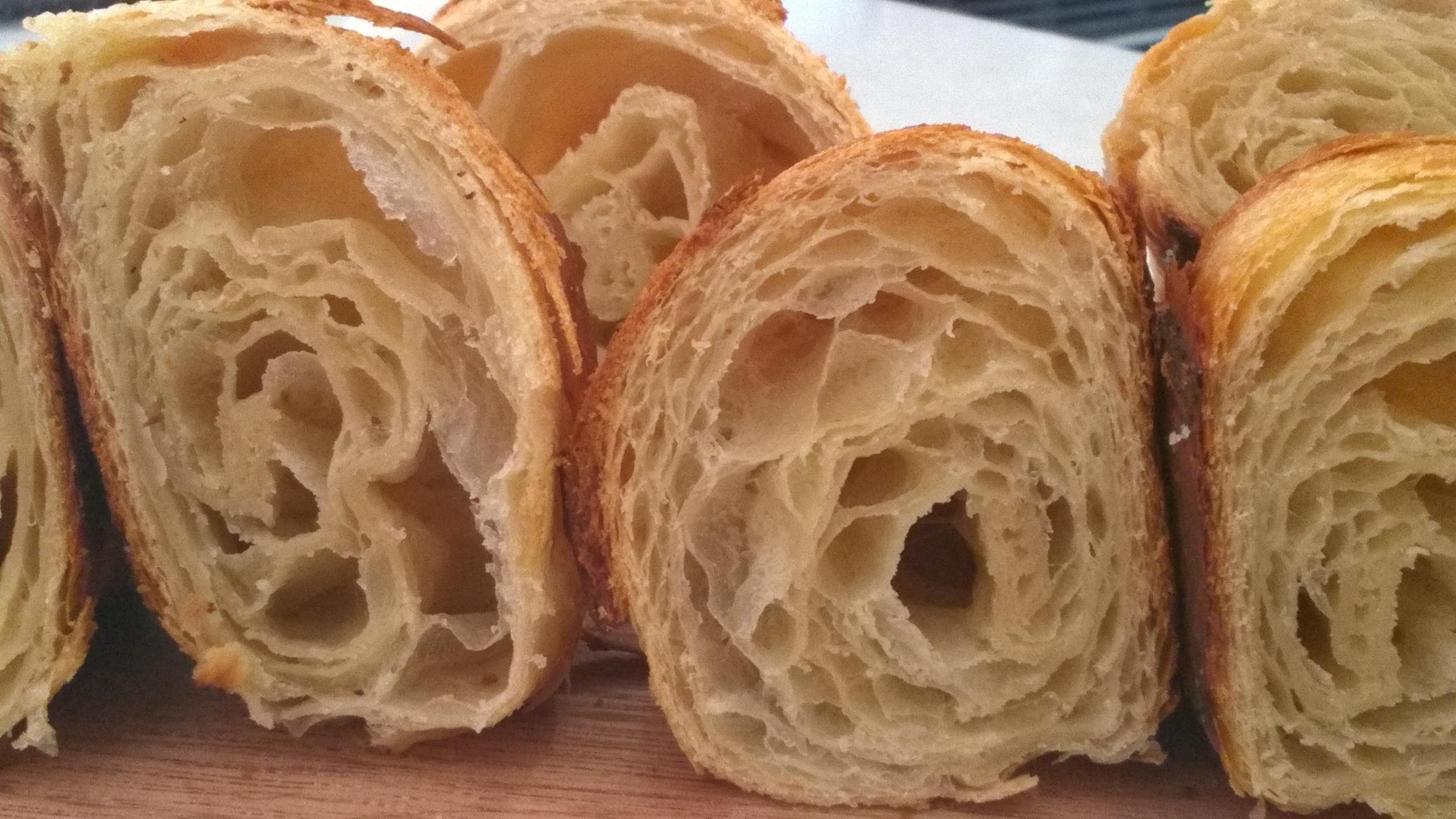 Getting better consistency especially in regards to size. With croissants, the sheet can easily be thicker in places which causes some to weigh considerably more than others. This batch saw all around 100g after bake (excluding any with filling). Additionally getting 7 steps on each seems easier with each iteration (again excluding ones with filling). A nice bulbous cross section and open crumb - some a little too cavernous but so far hotting hydration at about 53%, 1.5 hour final proof at 76f and a good 450f kicker for 5 mins seems to work out pretty well to get nice rise -